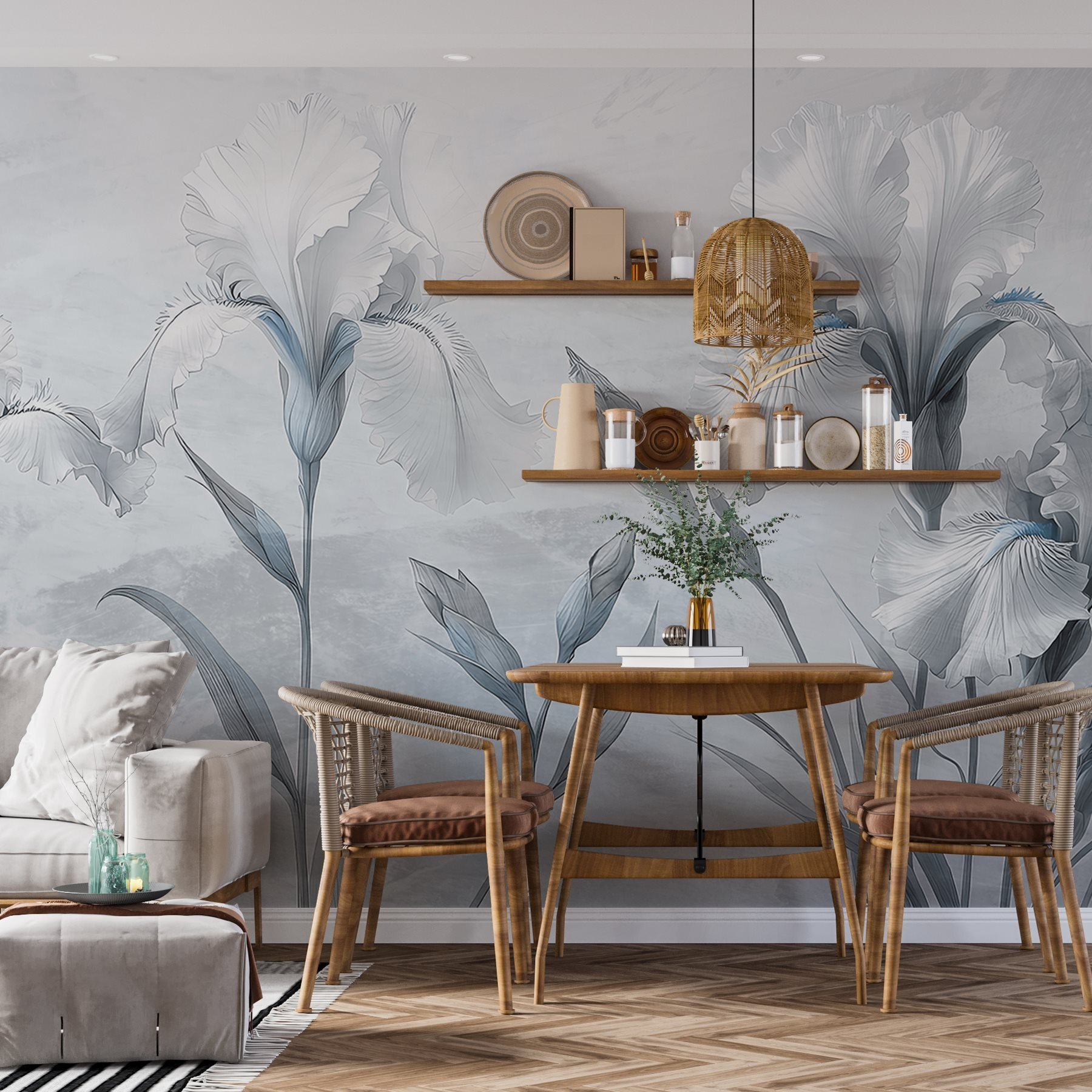 Transforme una pared lisa en un oasis de ensueño con este encantador mural con delicadas flores de iris en tonos suaves. Imagínese entrando en un espacio donde estas elegantes flores bailan suavemente en la pared, creando una calma instantánea. Los tonos suaves aportan un ambiente sereno, perfecto para cualquier habitación que necesite un poco de amor. Imagínate tomando un café en una mañana perezosa, sintiendo cómo esas vibraciones florales te levantan el ánimo. Es como tener un jardín siempre en flor, ¡sin tener que regarlo! Este mural no es sólo decoración; es una invitación a hacer una pausa, respirar y abrazar la belleza que nos rodea. Perfecto para crear un rincón acogedor o un telón de fondo sereno, es una opción encantadora que susurra estilo sin gritar.