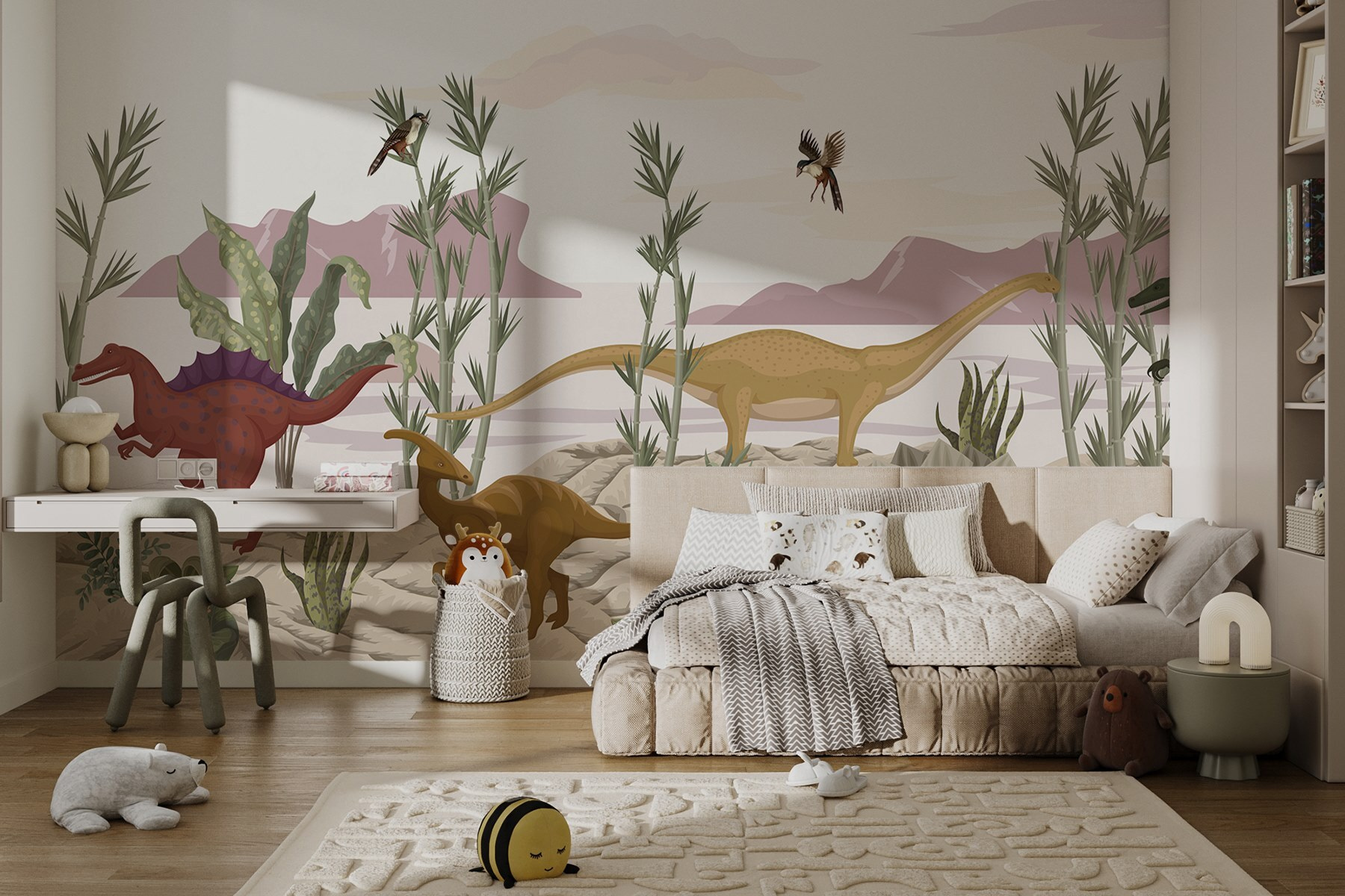 Transforme cualquier espacio con este vibrante mural que muestra un animado grupo de dinosaurios explorando un paisaje desértico. Imagínese entrar en una habitación donde gigantes amistosos como el gentil Brachiosaurus y el curioso Stegosaurus parecen cobrar vida en sus paredes. Los suaves tonos terrosos y la alegre vegetación crean un ambiente tranquilo y emocionante a la vez. Es el tema de conversación perfecto: a los niños les encantará señalar sus favoritos mientras sueñan en secreto con aventuras prehistóricas. Ya sea en una habitación de juegos o en un rincón acogedor, este mural te transporta a un mundo donde los dinosaurios prosperan. ¿Quién no querría un poco de la magia de los dinosaurios en su espacio?
