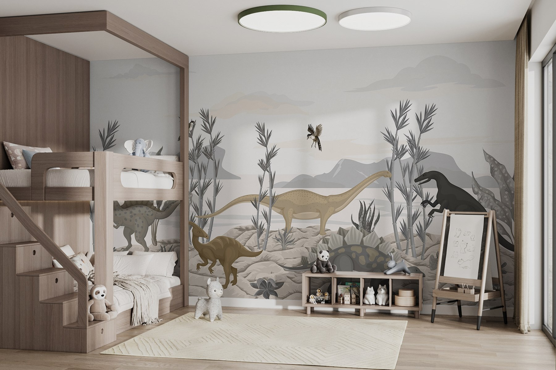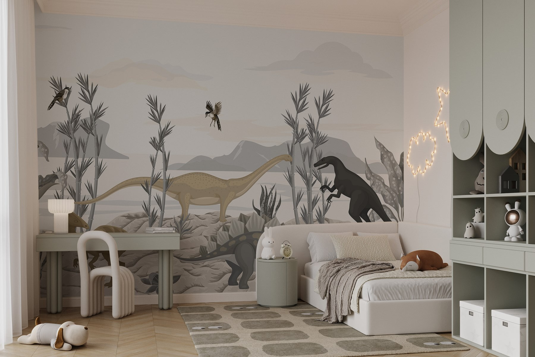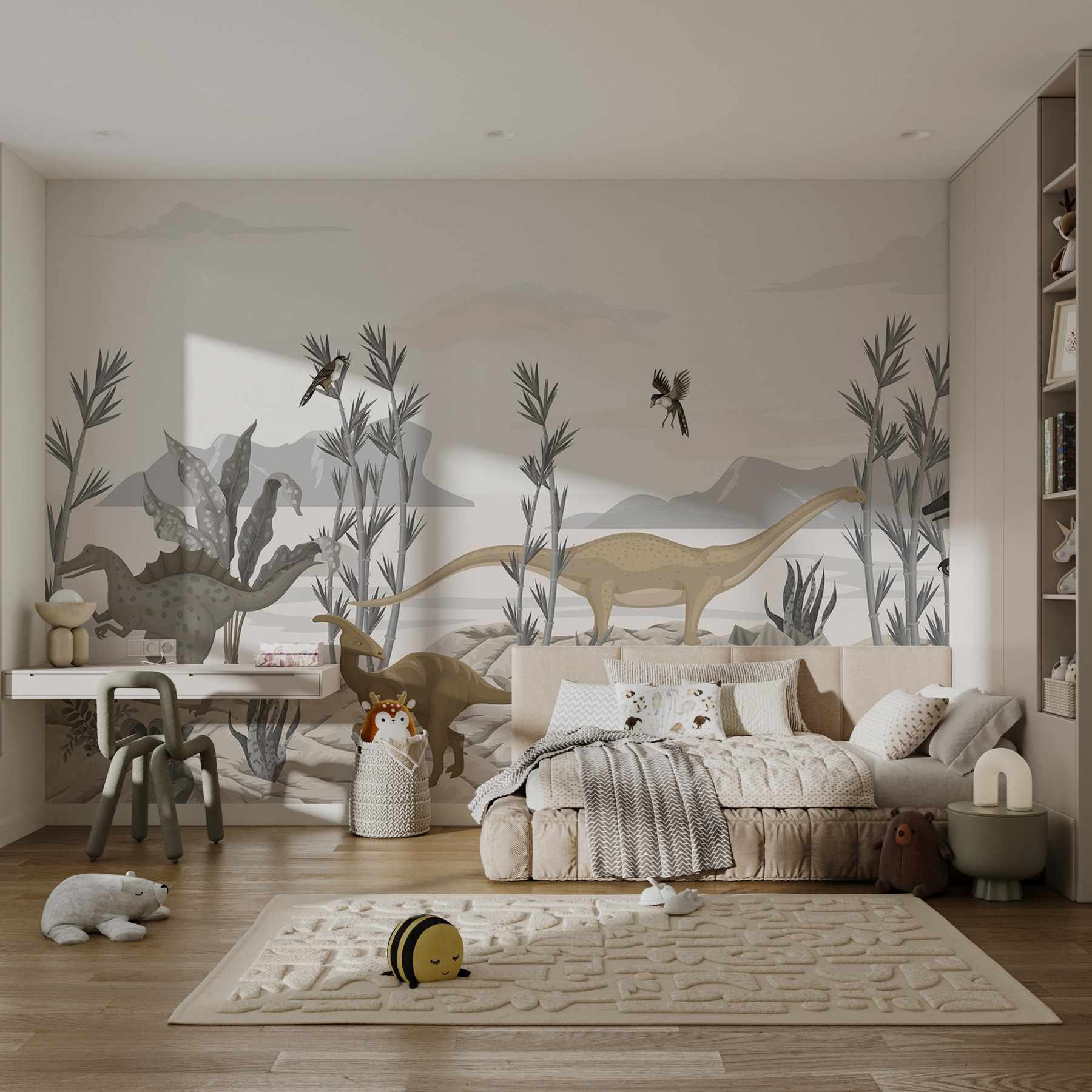 Transforma cualquier habitación en un paraíso prehistórico con este caprichoso mural de dinosaurios retozando en un desierto iluminado por el sol. Imagina a los pequeños exploradores mirando con los ojos muy abiertos a estos gentiles gigantes, ¡quizá incluso intentando imaginar qué harían si se encontraran con uno! Los tonos suaves y terrosos crean un ambiente tranquilo, por lo que es perfecto para una habitación infantil o un cuarto de juegos. Y seamos sinceros: ¿a quién no le gustaría sentirse como en el país de las maravillas de los dinosaurios? Tanto si inspira historias como aventuras lúdicas, este mural aporta alegría e imaginación a cualquier espacio. Ten cuidado con el pequeño T. rex, ¡podría acercarse sigilosamente!