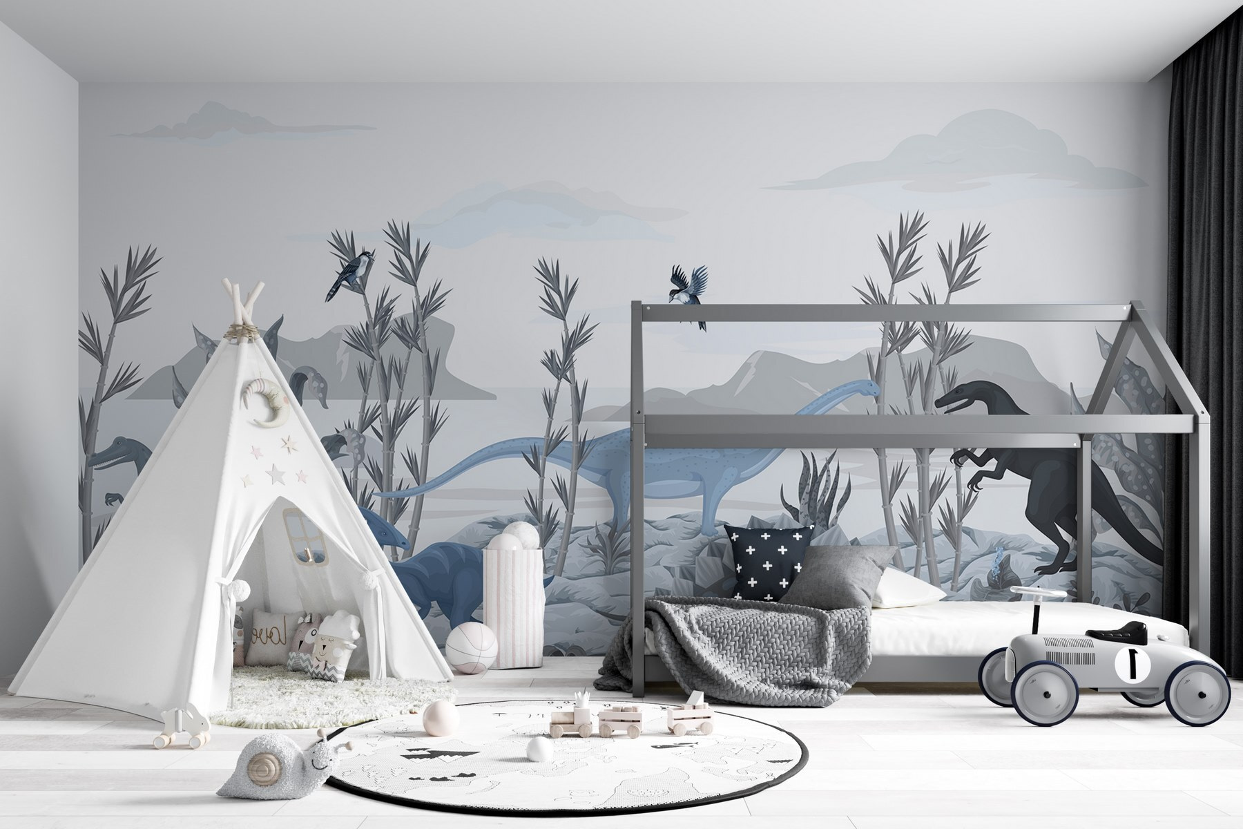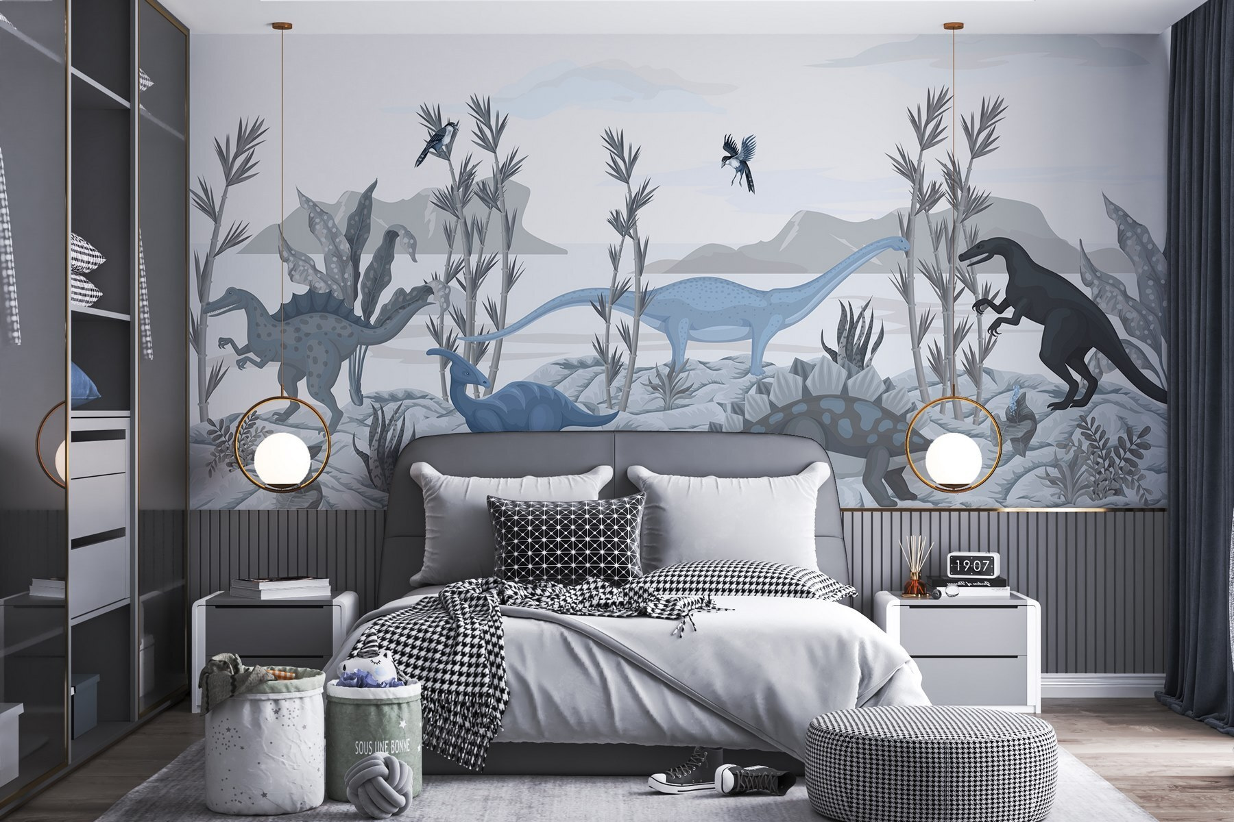 Transforme el espacio de un niño en una aventura prehistórica con este cautivador mural de dinosaurios. Imagina a los pequeños de ojos brillantes descubriendo un mundo por el que deambulan gigantes, haciendo volar su imaginación entre apacibles brontosaurios y feroces T. rex. Los relajantes colores y los intrincados detalles del paisaje crean una atmósfera serena, perfecta para soñar despierto o para la hora del cuento. Cuélgalo en un cuarto de juegos o en un dormitorio y verás cómo despierta la curiosidad y el asombro. No es sólo un mural, es una invitación a explorar un mundo en el que cada día puede parecer un poco más aventurero. Puede que los niños empiecen a soñar con escapadas con temática de dinosaurios.