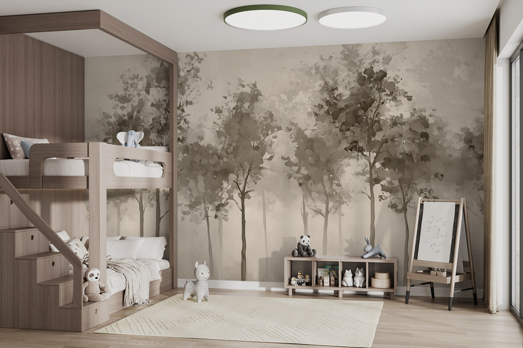 Transforme cualquier habitación en una escapada serena con este encantador mural de pared con árboles envueltos en una suave niebla. Imagínese tomando su café de la mañana mientras se pierde en la calma, tonos apagados que parecen susurrar dulces palabras de la naturaleza. Es como llevar la paz del bosque a su hogar. Este mural no es sólo decoración, es una inyección de ánimo. Perfecto para los que quieren un toque de tranquilidad sin hojas ni bichos en casa. Además, ¿a quién no le gusta sentirse como en un refugio de ensueño en el bosque?