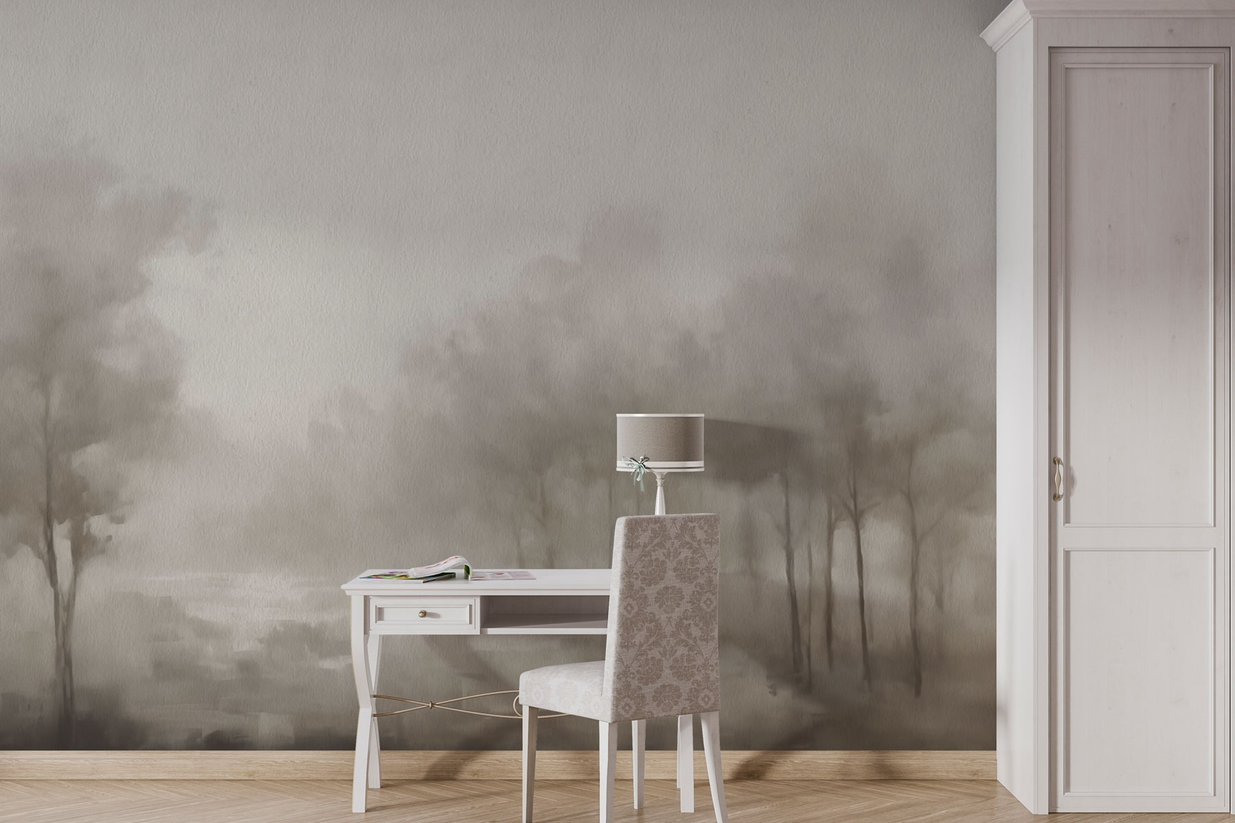 Transforme su espacio en una escapada de ensueño con este mural “Paisaje brumoso con árboles”. Imagínese despertarse con una suave niebla que se desliza entre serenos árboles, como un suave abrazo de la naturaleza. Es perfecto para una sala de estar o un dormitorio, ya que aporta una atmósfera relajante que hace que desee acurrucarse con un libro (y tal vez una taza de té) durante horas. Los tonos apagados se mezclan sin esfuerzo, invitando a la calidez sin llamar la atención. Piénsalo: puedes pasar las tardes soñando mientras disfrutas de la calma que desprende este mural. Es un pequeño rincón de tranquilidad en casa, que te invita a relajarte y descansar con estilo.