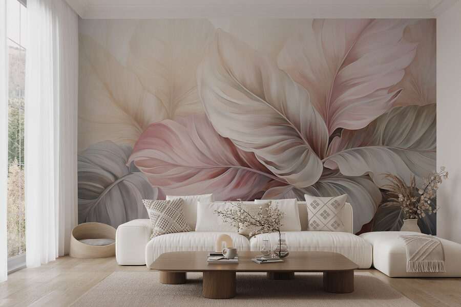 Transforme su espacio con este impresionante mural de pared, “Suaves tonos de la naturaleza se entrelazan maravillosamente”. Imagínatelo ahora: exuberantes hojas en suaves rosas y grises, envolviendo tus paredes en un suave abrazo. Es como traer un sereno jardín al interior, invitando a la calma y la calidez en cada rincón.