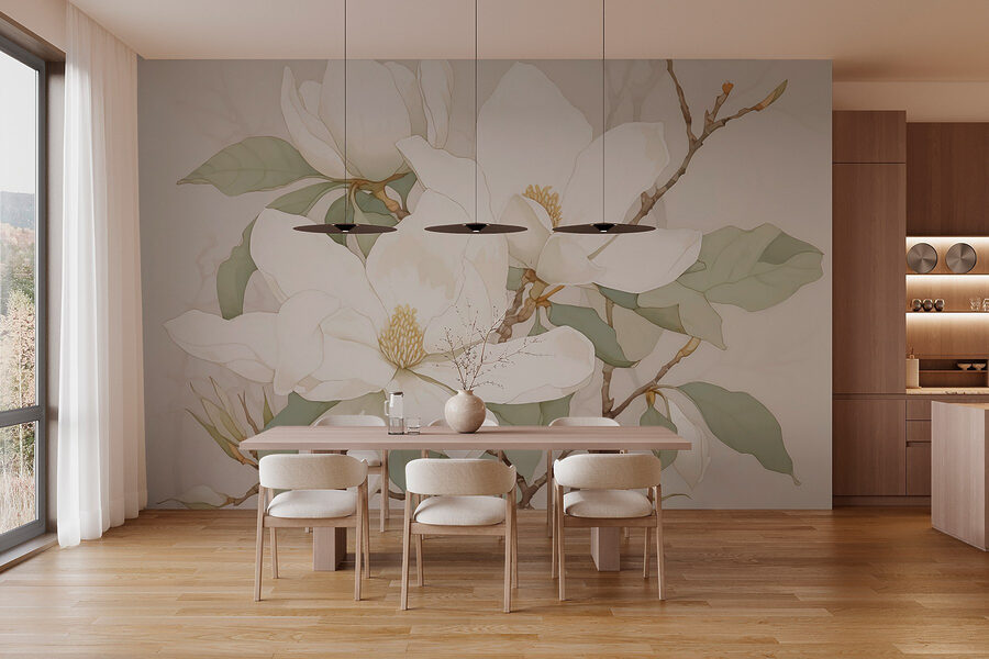 Transforme cualquier habitación con este impresionante mural de flores blancas. Imagine entrar en su espacio y ser recibido por flores suaves y serenas que casi parecen susurrar tranquilidad. Los delicados pétalos y los suaves verdes crean una atmósfera refrescante y relajante, perfecta para un acogedor rincón de lectura o un tranquilo dormitorio.