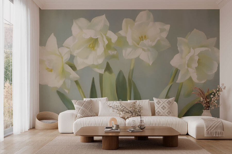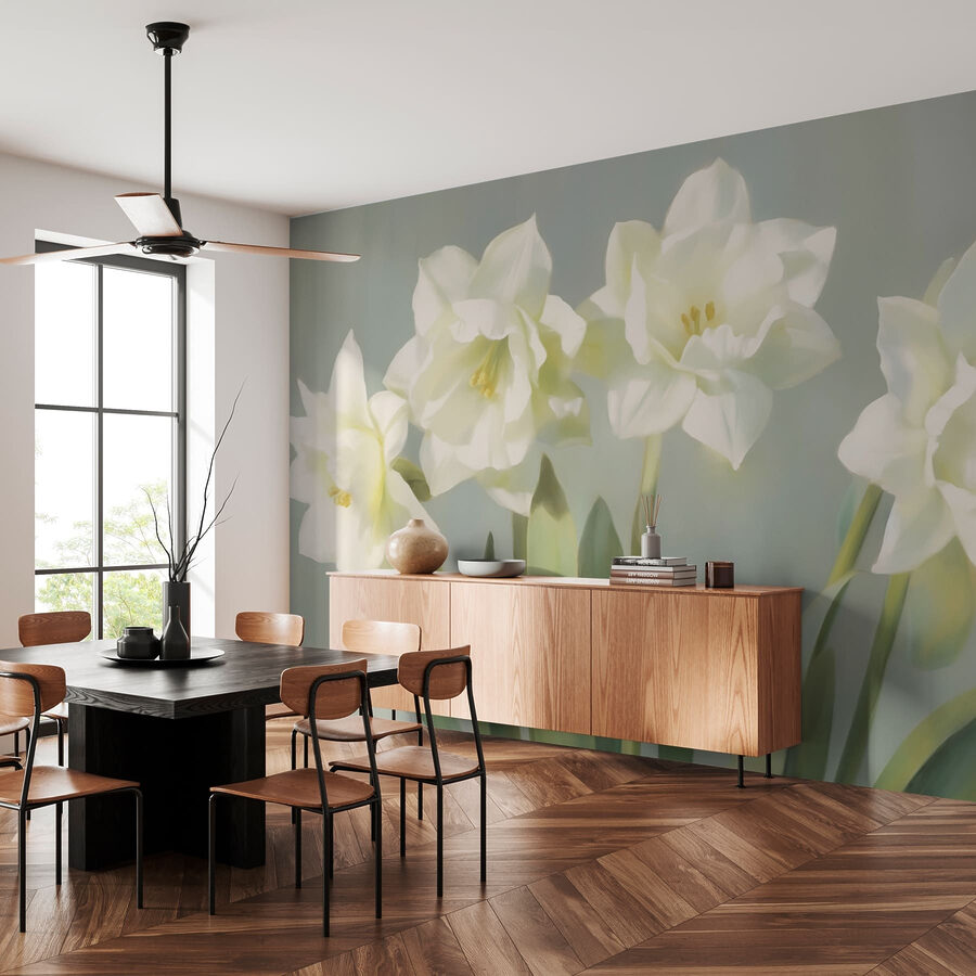 Transforme su espacio con este encantador mural que presenta un grupo de delicadas flores blancas. Imagine que entra en una habitación llena de un suave encanto que le hace sentir como si hubiera entrado en un tranquilo jardín. Los colores suaves bailan como susurros, creando una atmósfera calmante y refrescante. Perfecto para un rincón de lectura acogedor o un salón luminoso y aireado, añade ese toque de calidez al que es difícil resistirse. Puede que tus invitados se paren y se pregunten si están soñando cuando lo vean. Una forma encantadora de introducir un poco de naturaleza en tu vida, ¡sin necesidad de tener un pulgar verde!
