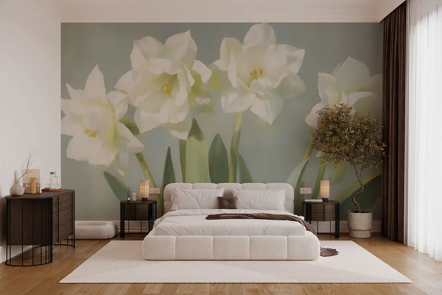 Transforme su espacio con este encantador mural que presenta un grupo de delicadas flores blancas. Imagine que entra en una habitación llena de un suave encanto que le hace sentir como si hubiera entrado en un tranquilo jardín. Los colores suaves bailan como susurros, creando una atmósfera calmante y refrescante. Perfecto para un rincón de lectura acogedor o un salón luminoso y aireado, añade ese toque de calidez al que es difícil resistirse. Puede que tus invitados se paren y se pregunten si están soñando cuando lo vean. Una forma encantadora de introducir un poco de naturaleza en tu vida, ¡sin necesidad de tener un pulgar verde!