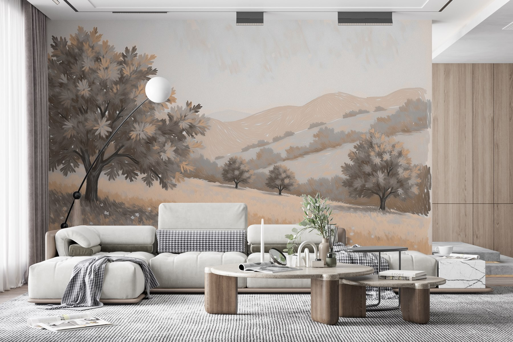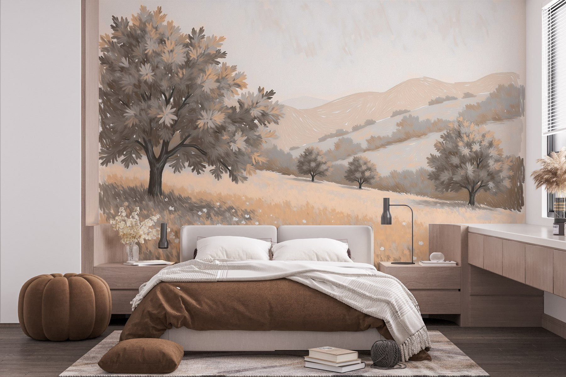 Transforme su espacio con un relajante mural de un paisaje salpicado de árboles y ondulantes colinas. Es como traer una suave brisa al interior: imagínese relajándose con su café, sintiéndose como en un prado sereno. Este mural te transporta a un mundo en el que las preocupaciones desaparecen. Los tonos sutiles lo hacen acogedor, mientras que las formas de las colinas lejanas despiertan los sueños. Perfecto para un salón, un dormitorio o incluso un rincón tranquilo, es el equivalente decorativo de un cálido abrazo. ¿Por qué no dejar que el encanto de la naturaleza envuelva tus paredes? Es mucho mejor que contemplar una simple pintura.