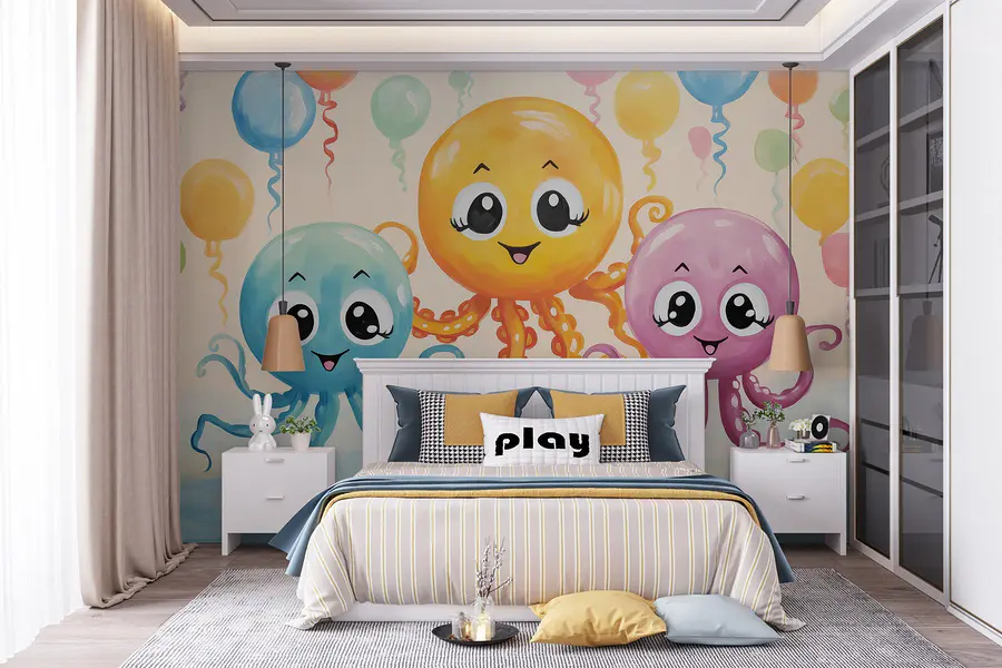 Sumérgete en un chapuzón de diversión con este alegre mural de alegres pulpos flotando con vibrantes globos. ¿Te imaginas alegrar una pared monótona? Estas adorables criaturas marinas, con grandes ojos sonrientes, aportan un toque de fantasía a cualquier habitación. Perfectas para un espacio infantil o incluso para un rincón juguetón donde bulle la creatividad. Imagínatelo: un espacio lleno de risas e imaginación juguetona, que inspire a los más pequeños a soñar a lo grande. Los colores vivos resaltan sobre el fondo suave, creando una atmósfera acogedora. Es algo más que decoración: ¡es como tener un festival de alegría en la pared!
