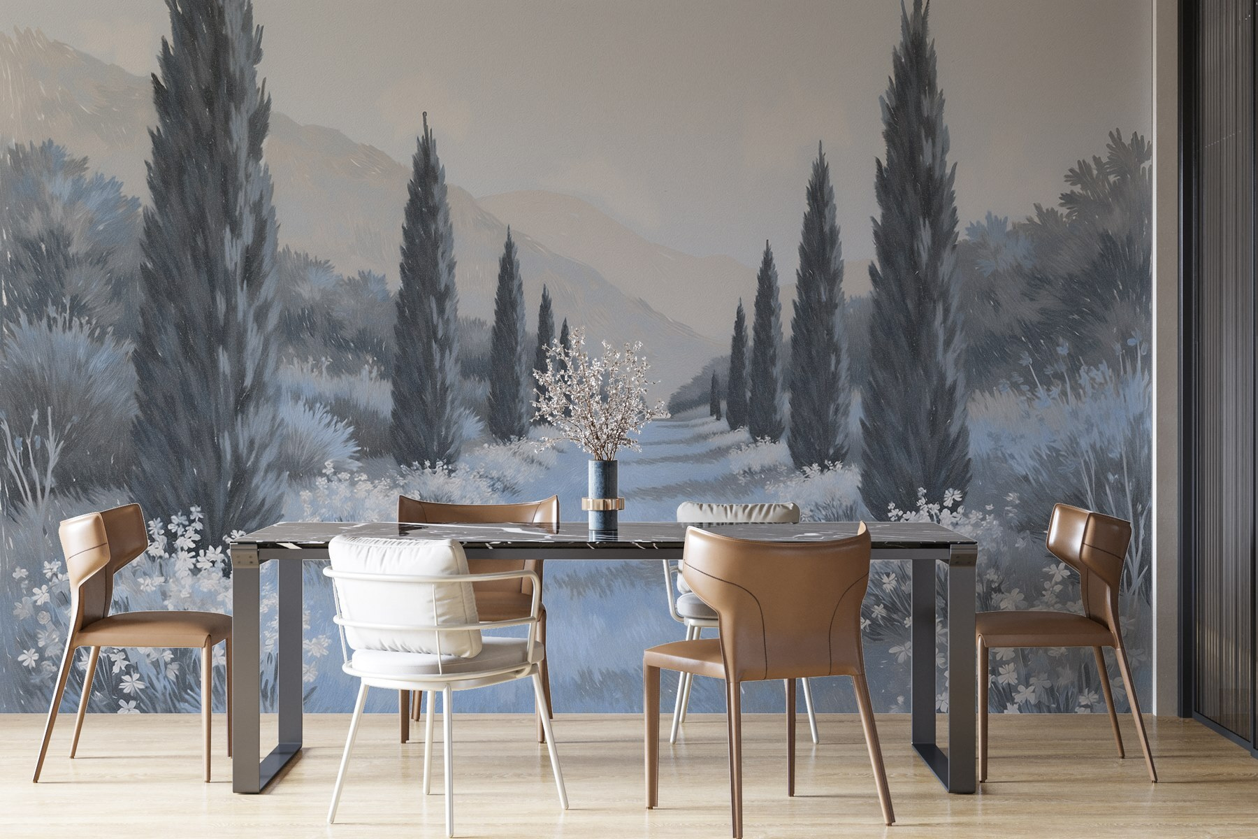 Transforme su espacio con este cautivador mural de pared, “Paisaje con árboles y flores”. Imagine adentrarse en un sereno camino bordeado de altos cipreses y delicadas flores que susurran los secretos de la naturaleza. Los tonos suaves crean una atmósfera relajante, perfecta para descansar después de un largo día. Es como respirar aire fresco en el interior, ¡sin insectos!