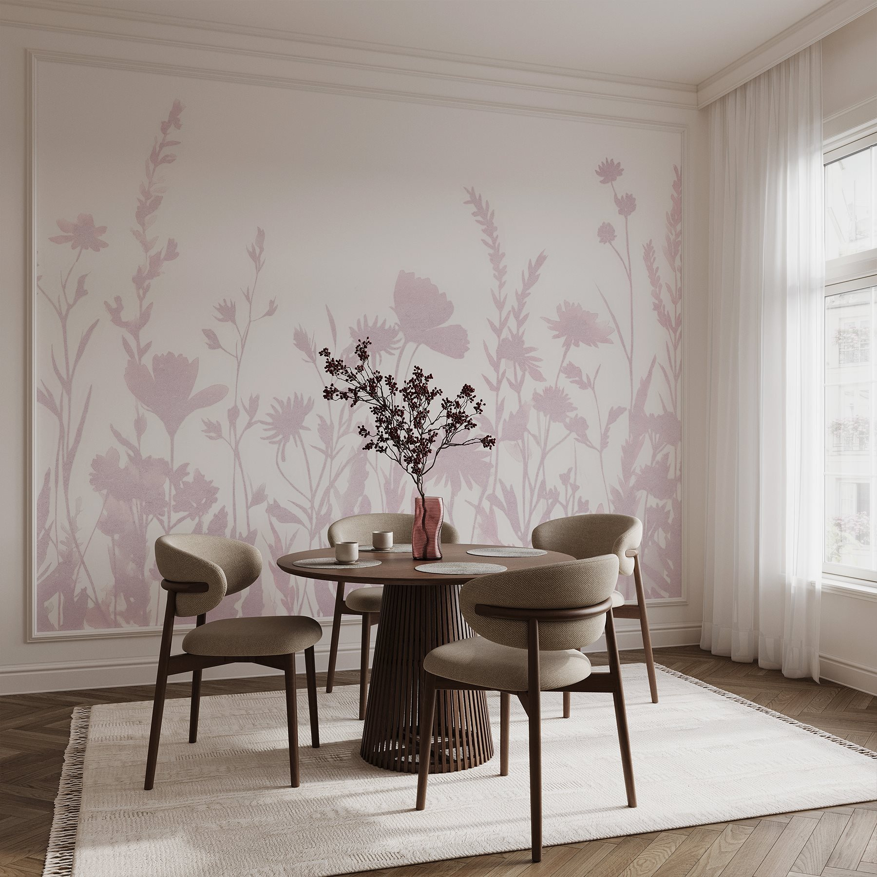 Transforme cualquier espacio en un sereno jardín con el mural “Flores suaves sobre fondo blanco”. Imagina despertarte con delicadas flores desplegando su belleza, susurrando dulces palabras a tus paredes. Es como un suave abrazo de la naturaleza, perfecto para rincones acogedores o para alegrar un pasillo aburrido. Además, es un fantástico tema de conversación: seguro que los invitados te preguntan por esas preciosas flores. Imagínate un día lluvioso en el que te apetezca evadirte en un país de las maravillas florales sin salir a la calle. ¡Voilà! Te levantará el ánimo al instante.