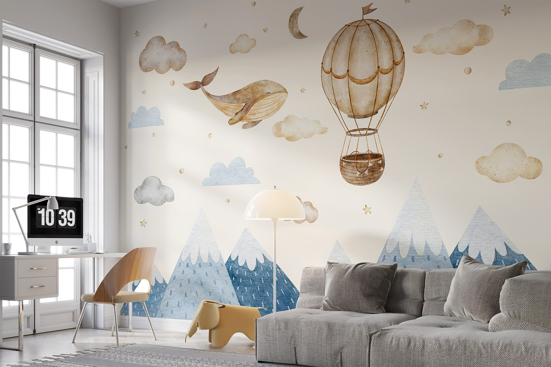 Imagínese entrar en una habitación llena de nubes, estrellas y una juguetona ballena que se eleva junto a un caprichoso globo aerostático. Este mural no es sólo decoración, ¡es una aventura a punto de suceder! Imagínese a los niños, con los ojos muy abiertos, imaginando que están en un viaje por el cielo, mientras que los adultos no pueden evitar sonreír ante la encantadora escena. La relajante paleta de colores aporta un ambiente tranquilo, ideal para dormitorios o rincones acogedores. Tanto si estás soñando, dejando tus pensamientos a la deriva o simplemente disfrutando de un momento de paz, este mural añade un toque único que resulta mágico y divertido a la vez. Perfecto para despertar la imaginación.