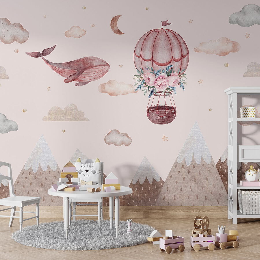 Imagina un mundo caprichoso en el que las ballenas planean por el cielo: ¡sí, eso es lo que ocurre aquí mismo con este mural! Con un encantador globo aerostático adornado con delicadas flores, es una escena encantadora que despierta la imaginación. Imagínatelo transformando la habitación de un niño o un acogedor rincón de lectura en una escapada de ensueño. Los colores suaves y las suaves montañas crean un ambiente sereno, perfecto para relajarse con un buen libro o soñar despierto. Es como una pequeña aventura en la pared: ¿a quién no le gustaría navegar por las nubes con una simpática ballena? Cuélgalo y deja que se despliegue la magia.