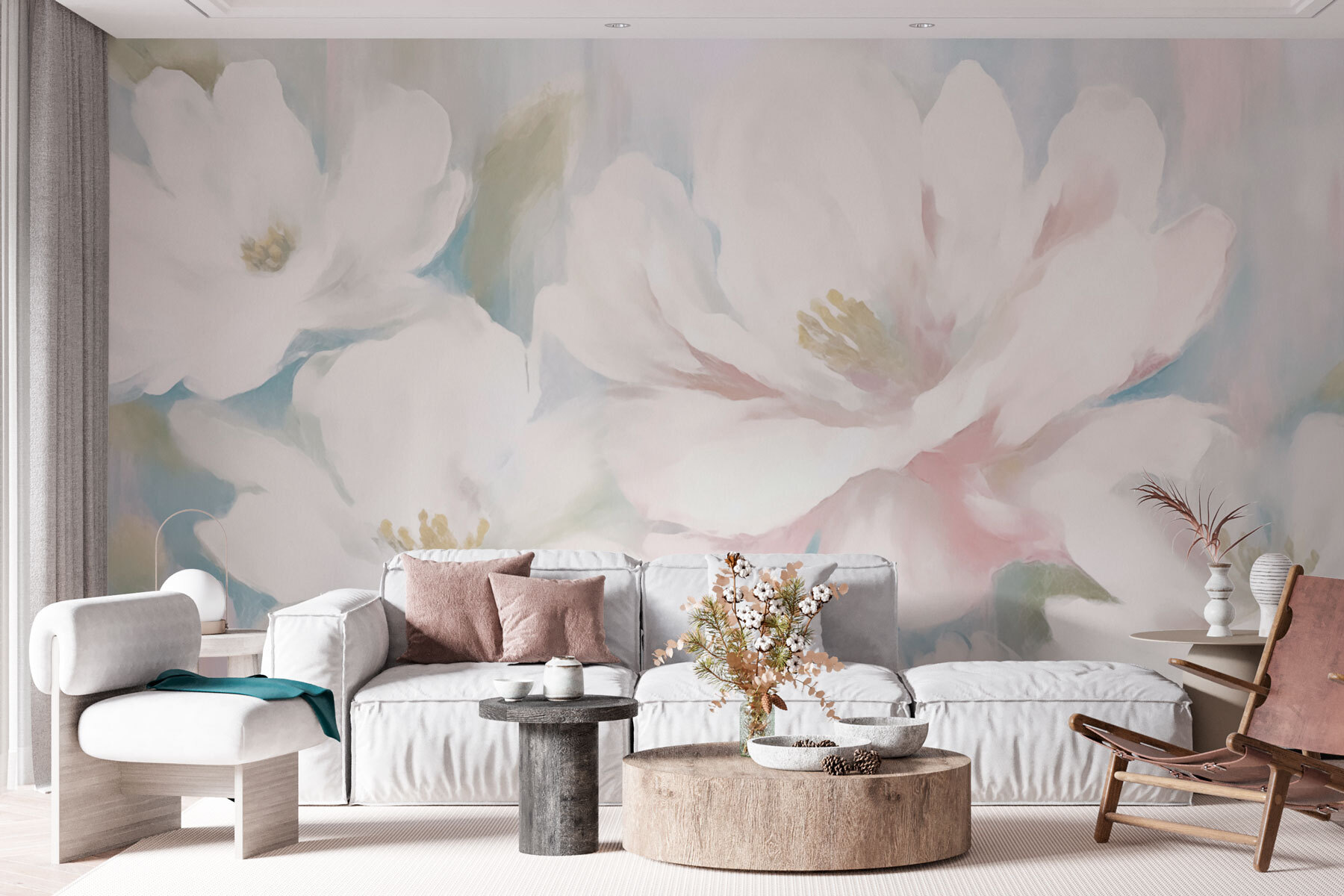 Transforme cualquier espacio con este encantador mural de flores blancas. Imagina que entras en un jardín sereno cada vez que entras en la habitación. El suave diseño de acuarela aporta un encanto suave que se siente fresco y acogedor, como una manta favorita en un día frío. Perfecto para crear ese ambiente de ensueño en un dormitorio o para añadir un toque de elegancia a una sala de estar. Imagínese tomando su café matutino, rodeado de estas delicadas flores, mientras su mente se llena de pensamientos primaverales. Es como si la propia naturaleza hubiera encontrado su camino hacia el interior, invitando a la calidez y a un poco de fantasía en la vida cotidiana.