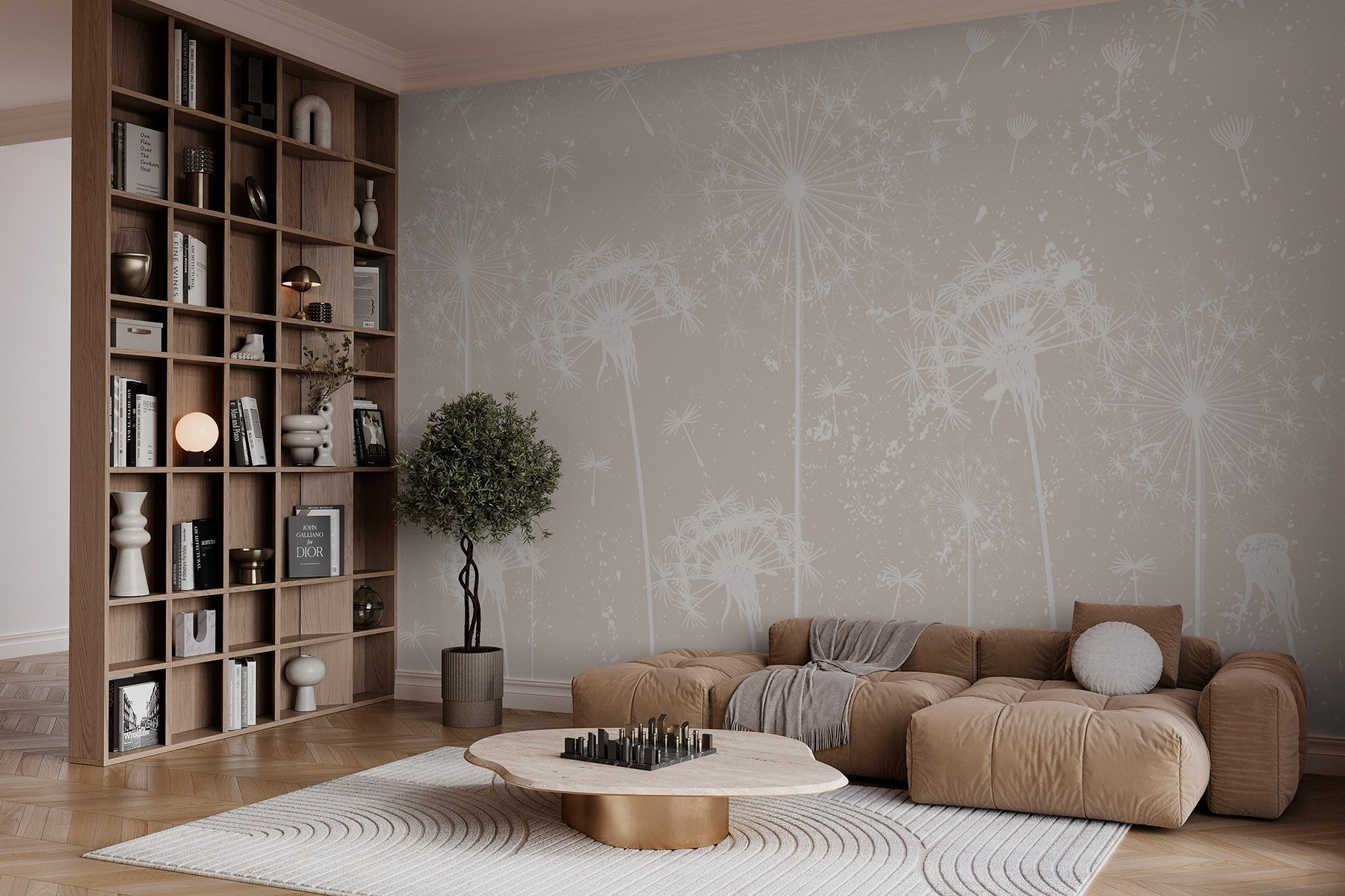 Imagínese esto: un espacio sereno transformado por la suave belleza de las flores blancas de diente de león. Este mural no es sólo decoración; es como traer una suave brisa al interior, susurrando historias de ligereza y sueños. Con esas delicadas flores enclavadas en un cálido telón de fondo, cada mirada es como una pequeña escapada a la naturaleza.