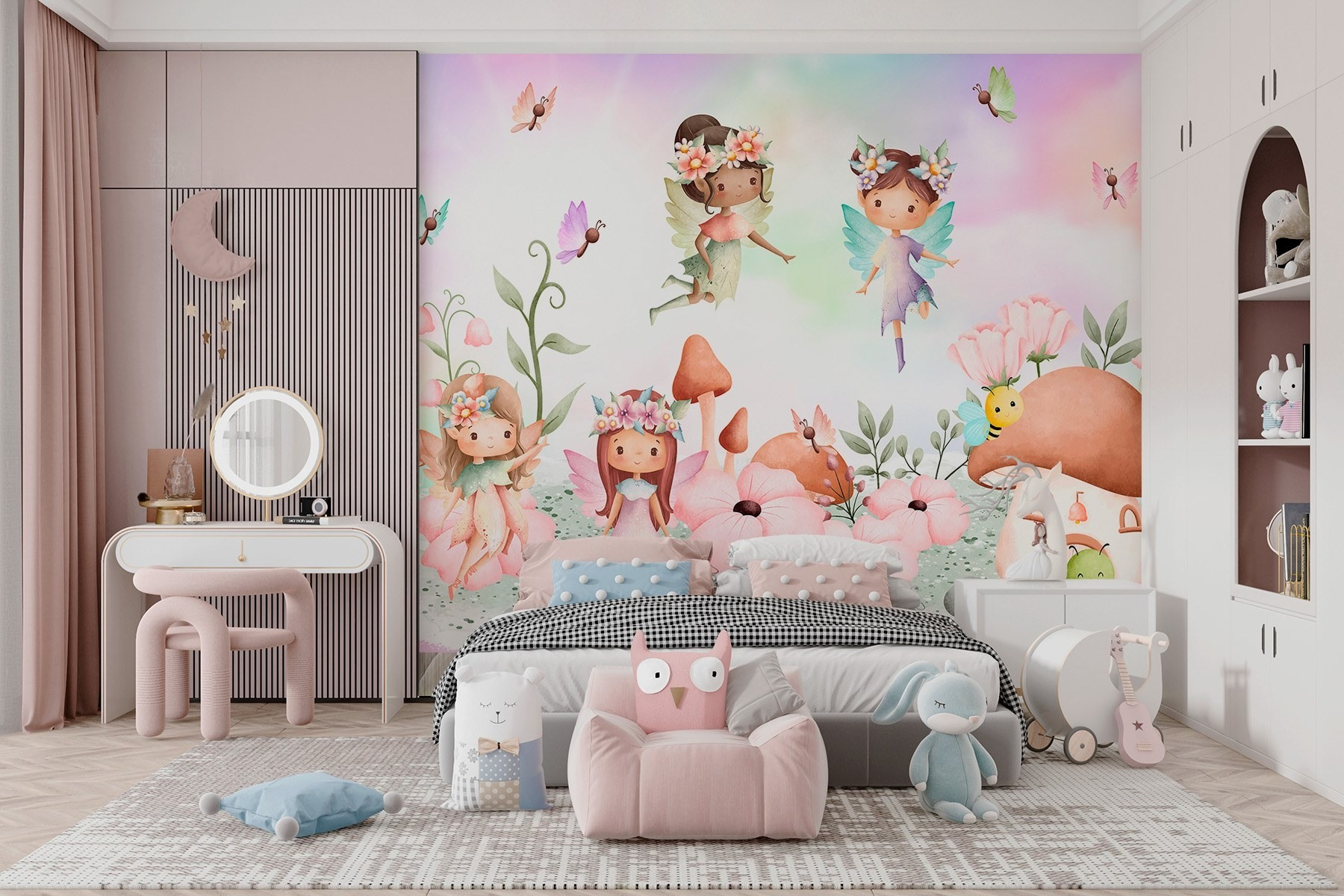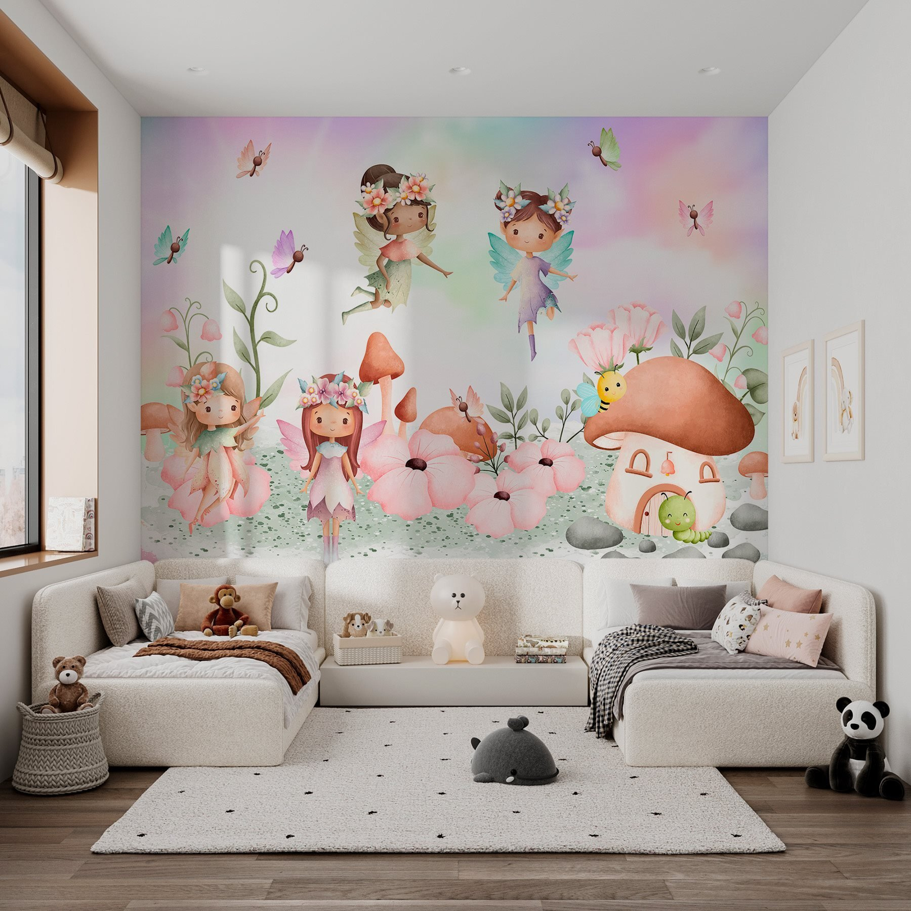 Transforma cualquier habitación en un caprichoso país de las maravillas con este encantador mural que muestra un encantador grupo de hadas retozando en un vibrante jardín. Imagínatelo: los más pequeños contemplando asombrados las hadas voladoras y las flores florecientes. Es la chispa de magia perfecta para el espacio de un niño, despertando su imaginación como el primer aleteo de una mariposa. Puede que incluso creen sus propios cuentos de hadas allí mismo, en la habitación. Además, ¿a quién no le gusta una abejita zumbando alrededor de una casa de setas? Cada día es como entrar en un libro de cuentos. ¡Te espera una auténtica aventura!