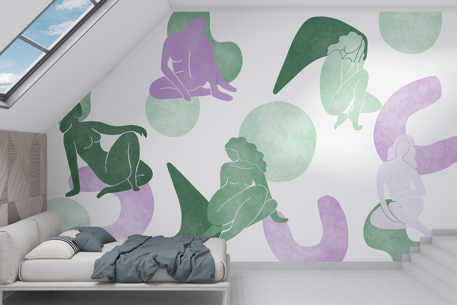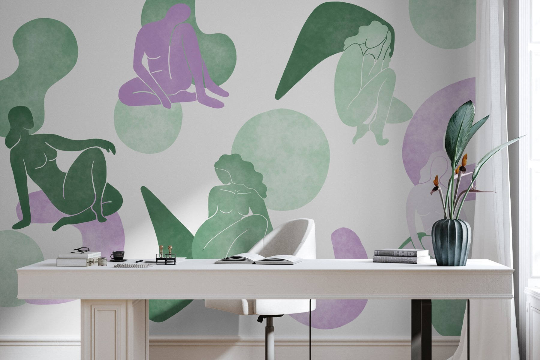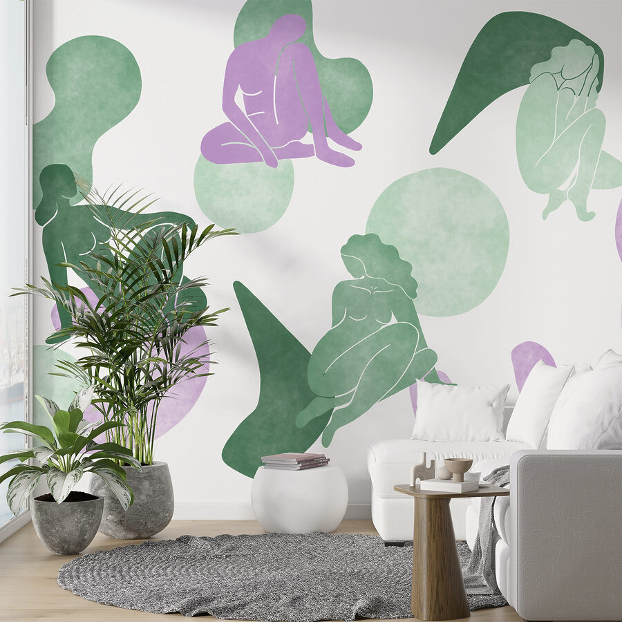 Los suaves tonos verdes y lavanda se mezclan sin esfuerzo, creando un fondo relajante que complementa varios estilos de decoración. Es perfecto para un rincón de lectura acogedor o un salón artístico. Imagínate cómo suscitará conversaciones cuando vengan invitados. Es más que un simple papel pintado; es como colgar una obra de arte que habla al corazón. Añada este mural y vea cómo su espacio se transforma en un refugio de estilo y confort.