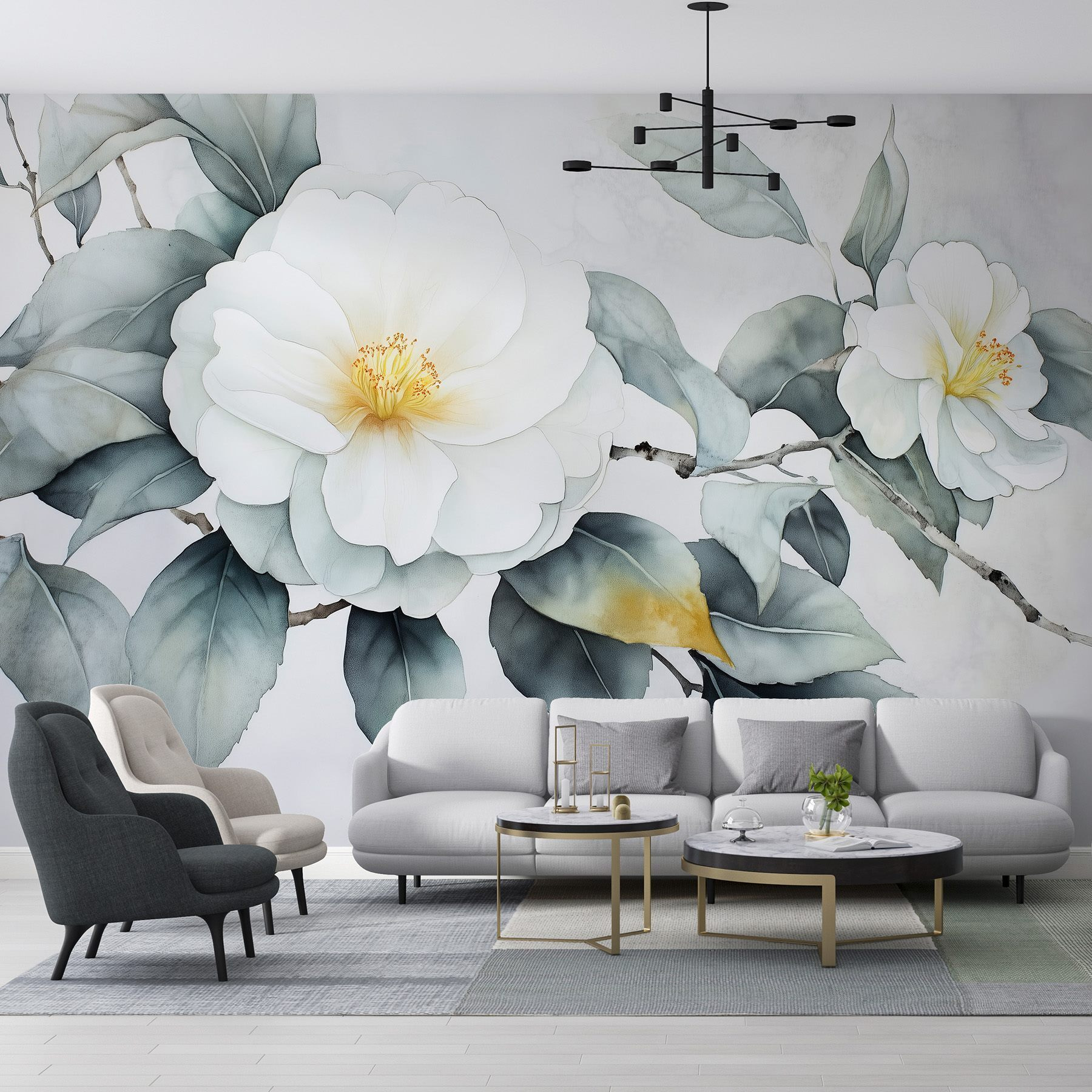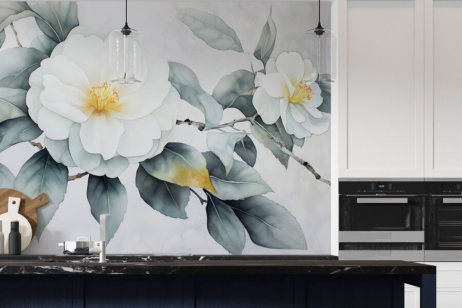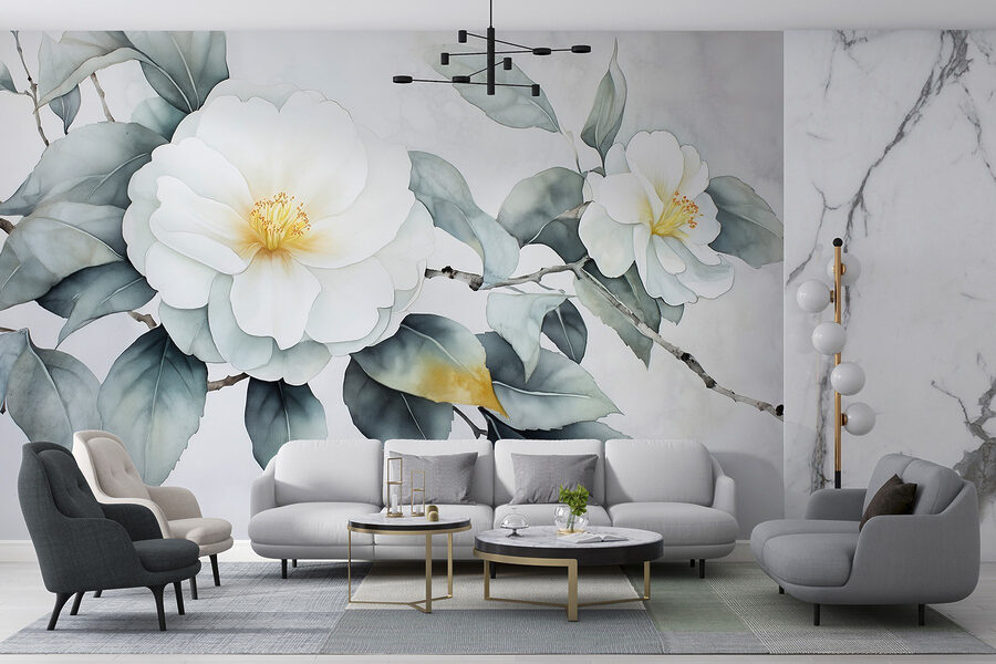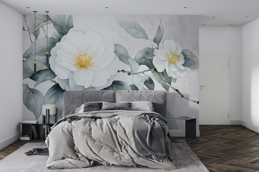 Transforme una pared aburrida en una escapada serena con este precioso mural de flores blancas con suaves hojas verdes. Es como llevar un soplo de aire fresco al interior sin necesidad de regar nada. Perfecto para esos días en los que un poco de vegetación puede levantar el ánimo, este mural crea un telón de fondo tranquilizador para cualquier habitación. Imagina tomarte el café de la mañana mientras contemplas esta belleza: son prácticamente unas minivacaciones. Además, es un gran tema de conversación, sobre todo cuando los invitados te preguntan por tu “jardín secreto”. ¿Quién necesita un completo cambio de imagen floral cuando este mural es suficiente?