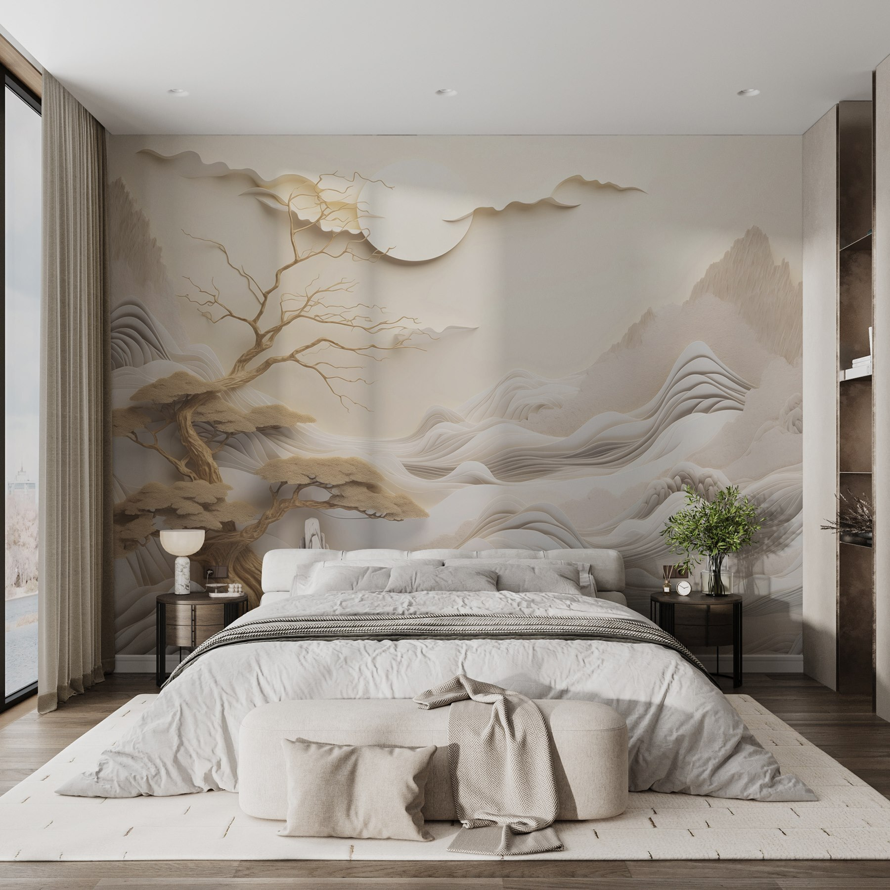 Transforme cualquier habitación en una escapada tranquila con este impresionante mural de pared que muestra un árbol, montañas, nubes y un gran sol. Es como traer una serena vista de la montaña al interior, sin tener que subir una caminata. Imagínese tomando un café mientras disfruta del suave resplandor del sol asomándose entre las montañas. Perfecto para una sala de estar o un rincón de lectura acogedor, es un tema de conversación que hará que los invitados reflexionen sobre los misterios de la vida. Además, los tonos apagados crean un ambiente tranquilo que facilita la relajación: ¿quién no querría un poco del abrazo de la naturaleza? Sinceramente, este mural es el mejor telón de fondo para domingos perezosos o fiestas de baile espontáneas.