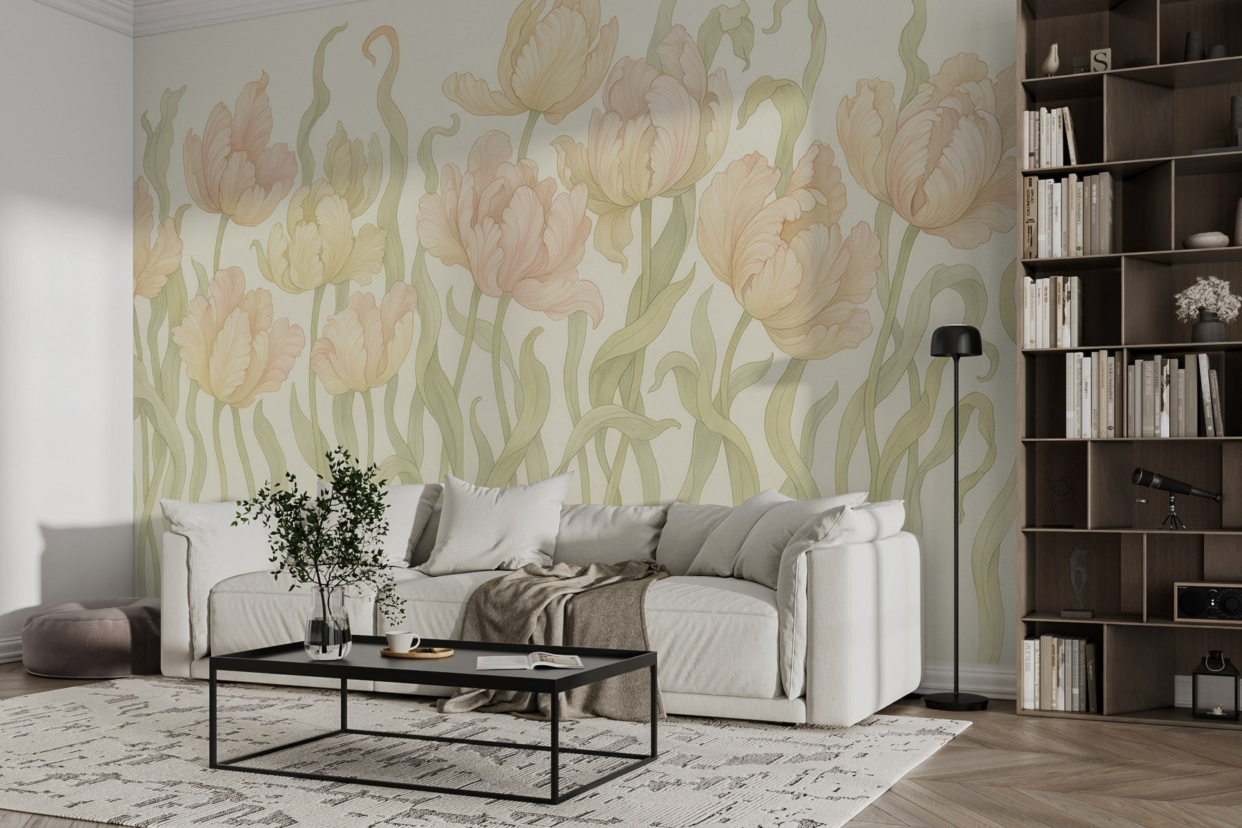 Transforme una pared apagada en un país de las maravillas en flor con este impresionante mural que muestra delicados tulipanes en colores suaves. Imagínese entrar en un jardín sereno todos los días, donde estas hermosas flores se mecen suavemente en una brisa imaginaria. Los suaves tonos pastel invitan a la calidez, haciendo que cualquier habitación resulte acogedora y acogedora, perfecta para el café de la mañana o para relajarse después de un largo día. Tus amigos pensarán que tienes un jardín secreto escondido. Es como el abrazo de la naturaleza en tu pared, recordando a todo el mundo que la belleza está realmente a sólo una mirada de distancia. Perfecto para cualquier espacio que desee un toque de encanto.