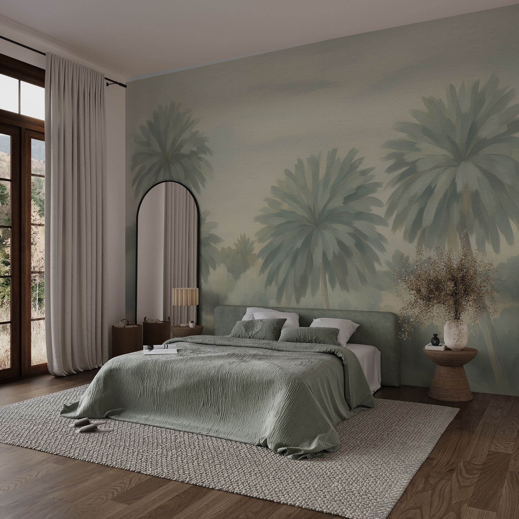 Transforme cualquier habitación en un oasis tropical con este impresionante mural de palmeras. Es como llevar un trozo de paraíso al interior, sin riesgo de quemaduras solares. Imagínatelo: saboreando tu café matutino mientras contemplas a estos gentiles gigantes mecidos por una suave brisa. Los tonos apagados crean un telón de fondo sereno, perfecto para relajarse. Ideal para salones, dormitorios o incluso acogedores rincones de lectura, añade un toque de naturaleza sin el mantenimiento de las plantas reales. Este mural invita a soñar despierto con playas de arena y brisas cálidas. ¿A quién no le gustaría?