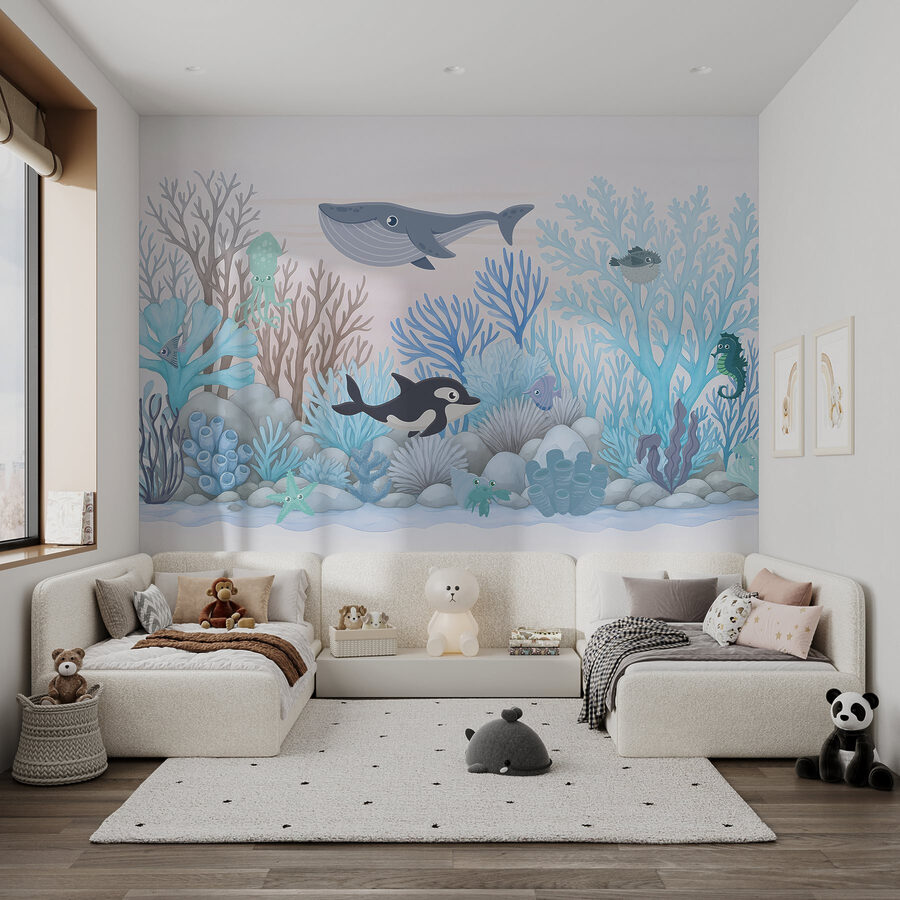 Sumérgete en un chapuzón de diversión con este mural de pared que presenta una caprichosa aventura submarina. Imagina simpáticas criaturas marinas retozando entre corales vibrantes, creando un ambiente lúdico perfecto para habitaciones infantiles o zonas de juego. Los azules suaves y las formas suaves invitan a una sensación de calma, haciendo que cualquier espacio se sienta casi como un escondite secreto en el océano. Imagínese a los más pequeños señalando a la orca o riéndose del calamar tonto: cada mirada les arranca una sonrisa. Este mural no es sólo decoración; es una puerta a un mundo lleno de imaginación. Transforma paredes vacías en un animado paisaje marino que hará que todos se sientan como si acabaran de descubrir un tesoro bajo las olas.