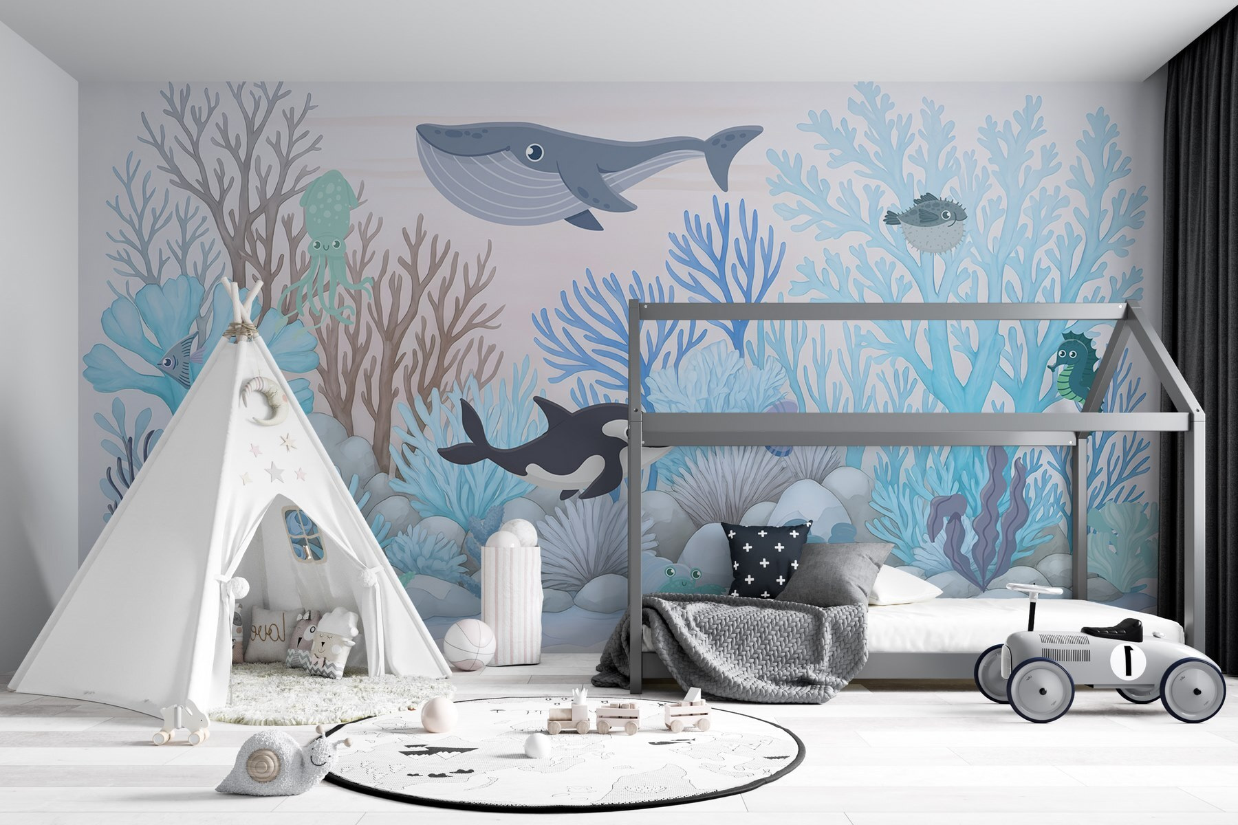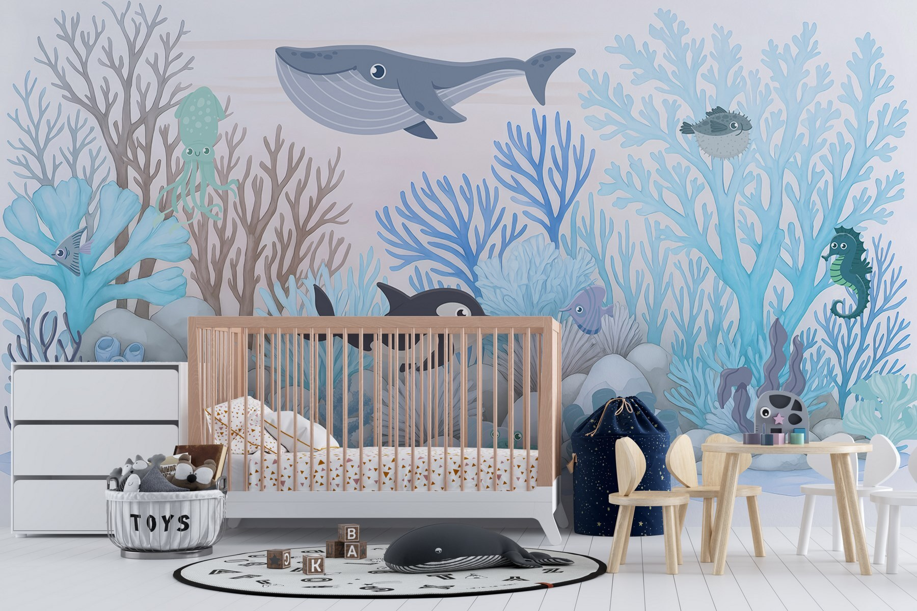 Sumérgete en un chapuzón de diversión con este mural de pared que presenta una caprichosa aventura submarina. Imagina simpáticas criaturas marinas retozando entre corales vibrantes, creando un ambiente lúdico perfecto para habitaciones infantiles o zonas de juego. Los azules suaves y las formas suaves invitan a una sensación de calma, haciendo que cualquier espacio se sienta casi como un escondite secreto en el océano. Imagínese a los más pequeños señalando a la orca o riéndose del calamar tonto: cada mirada les arranca una sonrisa. Este mural no es sólo decoración; es una puerta a un mundo lleno de imaginación. Transforma paredes vacías en un animado paisaje marino que hará que todos se sientan como si acabaran de descubrir un tesoro bajo las olas.