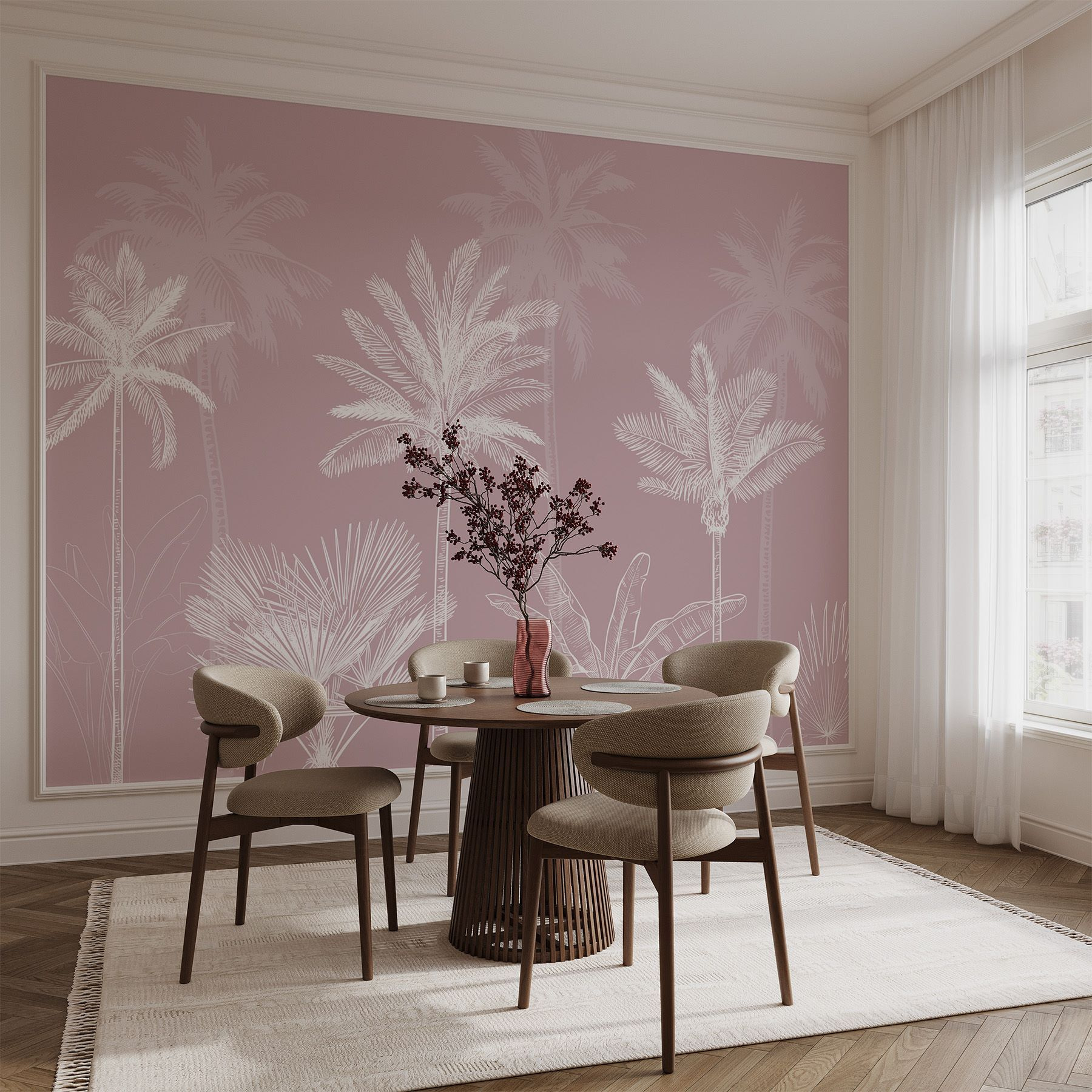 Transforme cualquier habitación con este encantador mural “Grupo de palmeras”. Imagínese entrar en una serena escapada tropical cada vez que entre en su espacio. El fondo rosa suave y apagado invita a un ambiente acogedor, por lo que es un telón de fondo perfecto para una noche de relax después de un largo día. Es como si de repente tu apartamento tuviera la brisa del mar, pero sin la arena en los zapatos. Esas palmeras de intrincados dibujos añaden un toque de elegancia, pero sin tomarse demasiado en serio a sí mismas. Desde el salón hasta el despacho, es un guiño divertido a la naturaleza que da vida a las paredes. Perfecto para soñar despierto.
