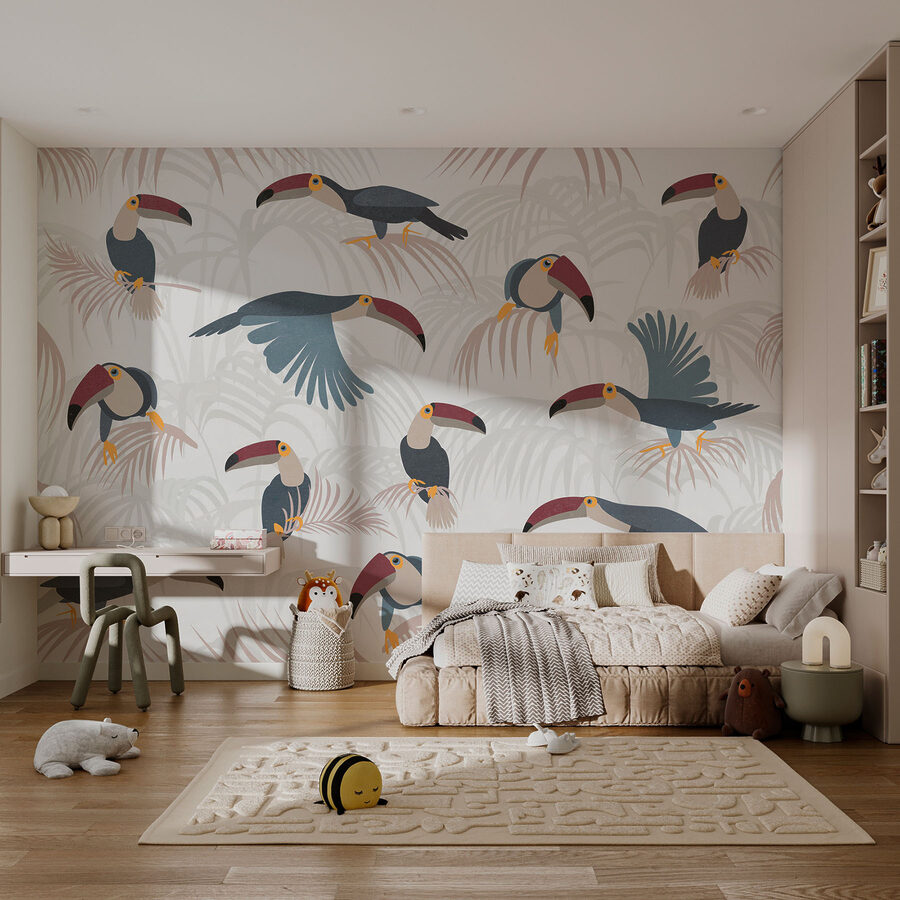 Imagínese que entra en un espacio que parece un refugio tropical, donde los vibrantes dibujos de pájaros y las exuberantes plantas le levantan el ánimo al instante. Este mural, lleno de extravagantes tucanes posados entre alegres hojas de palmera, aporta calidez y fantasía a cualquier pared. Es como tener un alegre trocito de naturaleza en casa, ¡perfecto para esos días en los que sólo quieres escapar! Ya sea para iluminar un acogedor salón o para dar un toque de estilo a un despacho, este mural te invita a relajarte con estilo. ¿Quién no sonreiría al ver esos curiosos pájaros? Deje que los colores bailen a su alrededor y transforme cualquier habitación en un alegre paraíso.