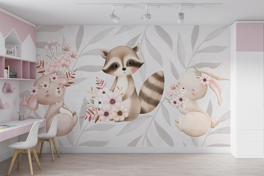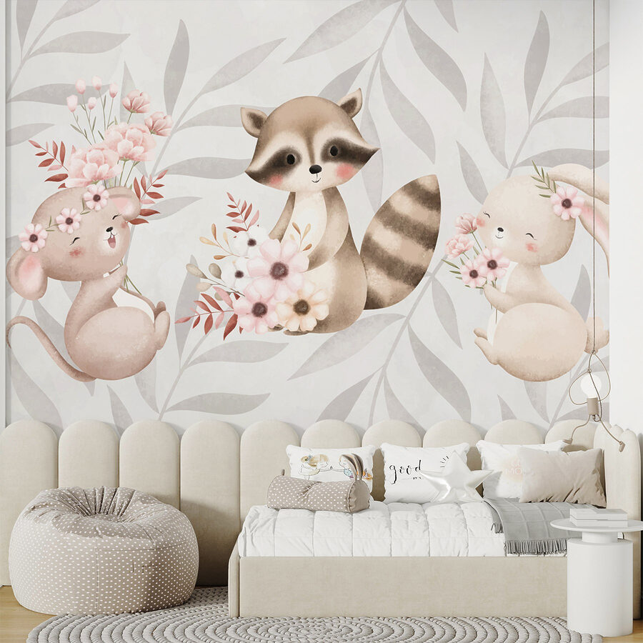 Transforma una pared aburrida en un paraíso de fantasía con este encantador mural en el que aparecen un mapache y un conejo, cada uno con un ramo de flores en la mano. Es como llevar un trocito de naturaleza a su hogar, donde estos encantadores bichos parecen cobrar vida ante sus ojos. Imagina entrar en una habitación y sentir al instante las sonrisas de tus invitados. Los tonos neutros y los gráficos suaves crean un ambiente acogedor, perfecto para guarderías, salas de juegos o incluso ese rincón de lectura tranquilo que siempre quieres renovar. Cada mirada a estos adorables animales puede provocar un poco de alegría, recordándote que a veces la vida son las pequeñas cosas, como las flores y los amigos peludos. Es una forma de entablar conversación, un toque de alegría y, sinceramente, ¿quién puede resistirse a esas caras tan bonitas?