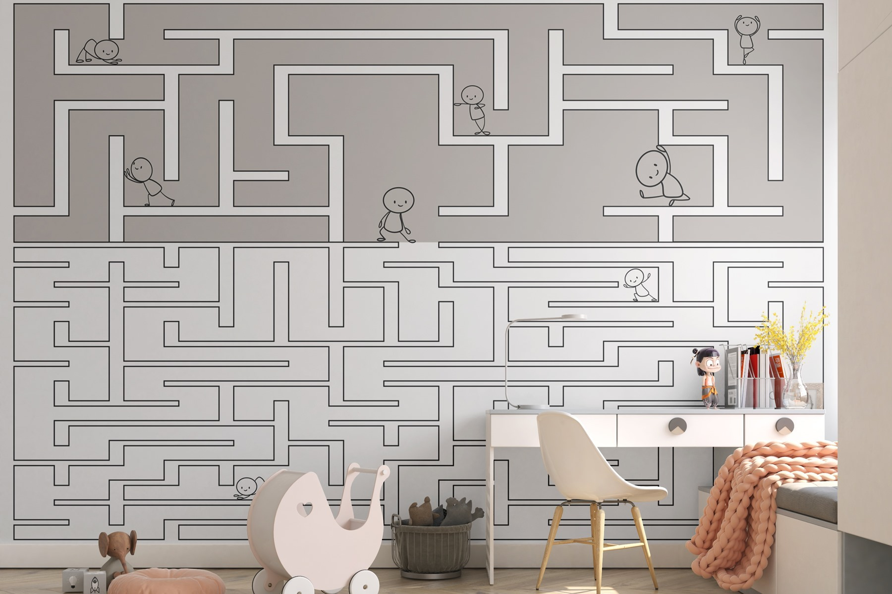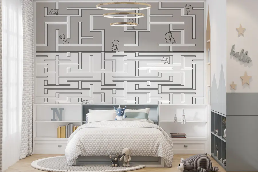 Transforma un espacio sencillo en una caprichosa aventura con este laberinto mural. Es como un minilaberinto en la pared, lleno de simpáticos personajes que deambulan por un laberinto. Imagina una habitación infantil rebosante de curiosidad, donde cada mirada despierta la imaginación.
