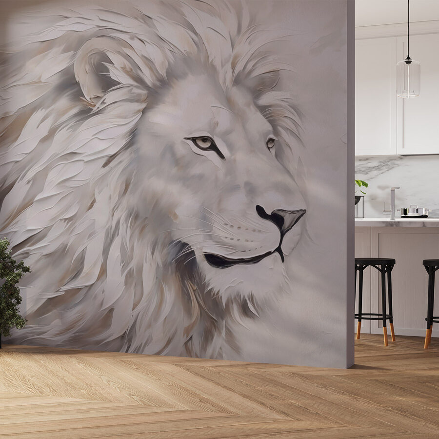 Adéntrese en un mundo en el que un sereno león blanco ocupa el centro del escenario, aportando sin esfuerzo un toque de elegancia salvaje a cualquier habitación. Este mural no es solo una obra de arte; es una declaración. Imagínese que pasa por delante de él todos los días y siente la fuerza tranquila que emana de esos ojos apacibles. La melena del león, que fluye como suaves nubes, podría inspirar sueños de aventuras en tierras lejanas o tardes acogedoras recordando los viajes salvajes de la vida.