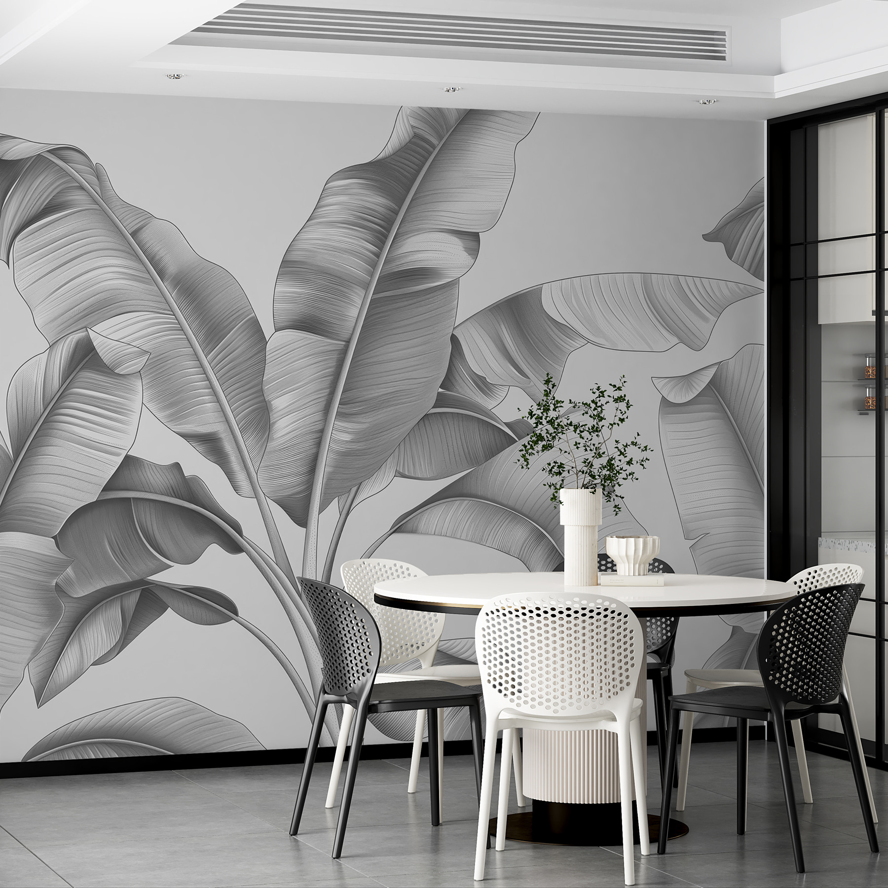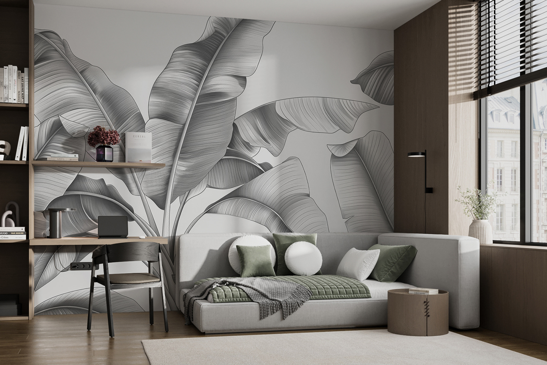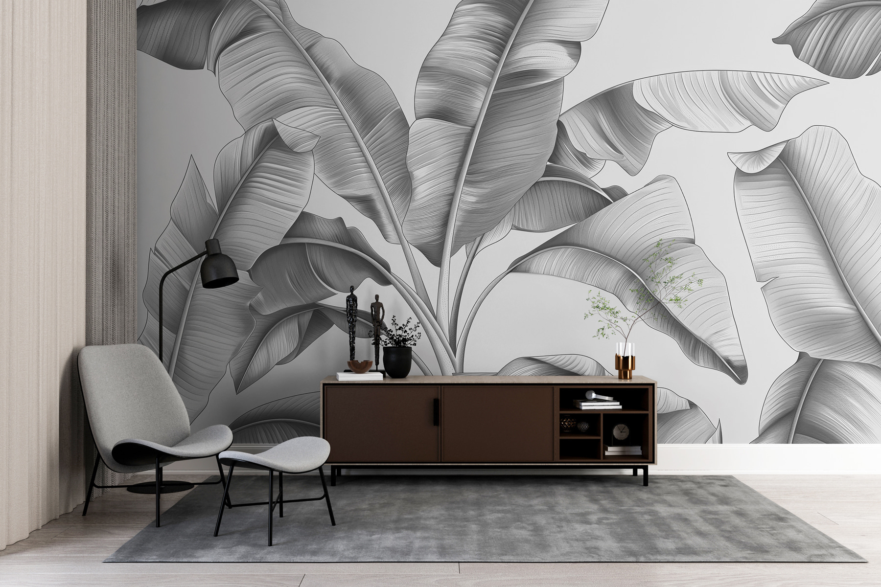 Tiene un aire a escala de grises que lo hace versátil para casi cualquier estilo de habitación, desde un salón moderno hasta un dormitorio sereno. Además, el efecto 3D añade tanta profundidad, ¡que puede que te sorprendas a ti mismo alargando la mano para tocar las hojas! En serio, hay algo tan relajante en estar rodeado de follaje, menos el riego y los bichos, claro.