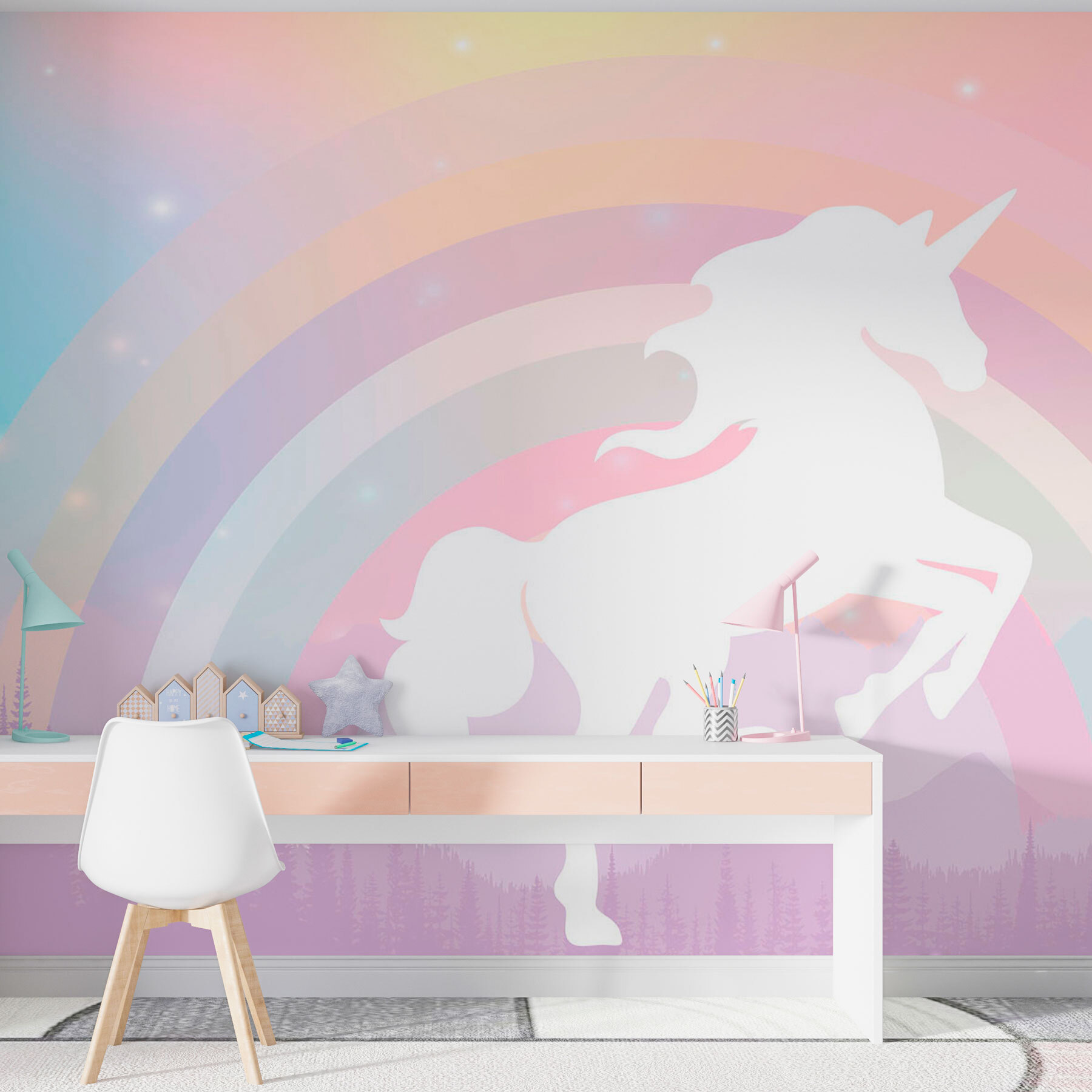 Transforma cualquier espacio en un caprichoso país de las maravillas con este encantador mural de unicornio. Imagínatelo: suaves tonos pastel que se mezclan en un arco iris de ensueño, mientras majestuosas montañas observan tranquilamente en el fondo. Este mural es como un cálido abrazo para tus paredes, invitando a una pizca de magia en tu vida cotidiana. Imagina las sonrisas que provocará en niños y adultos, despertando sueños de aventuras y reinos míticos. Perfecto para guarderías, salas de juegos o cualquier rincón que necesite una pizca de alegría. Es una escapada lúdica que hace que el hogar sea un poco más especial. ¿A quién no le gustaría tener un unicornio retozando encima del sofá?