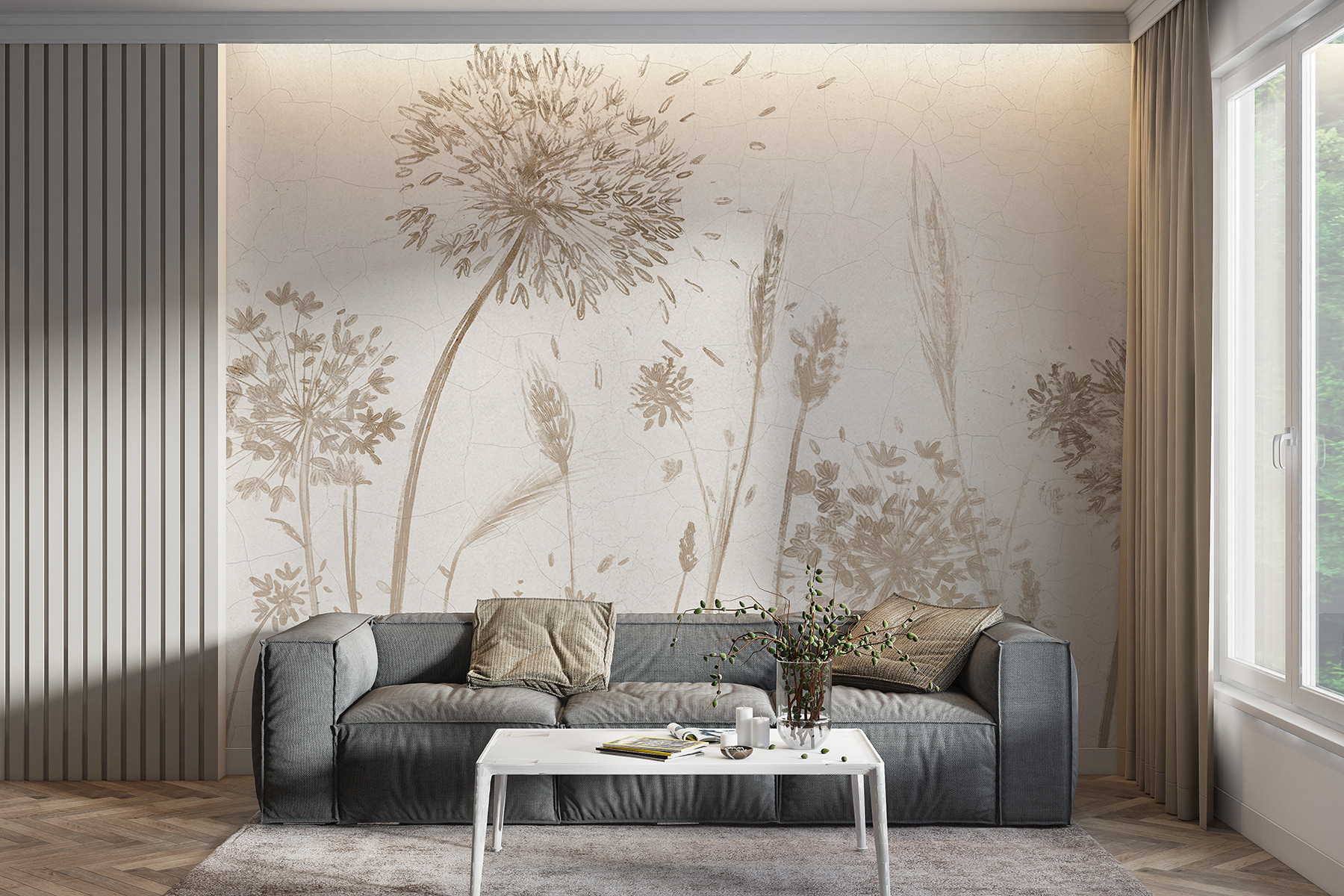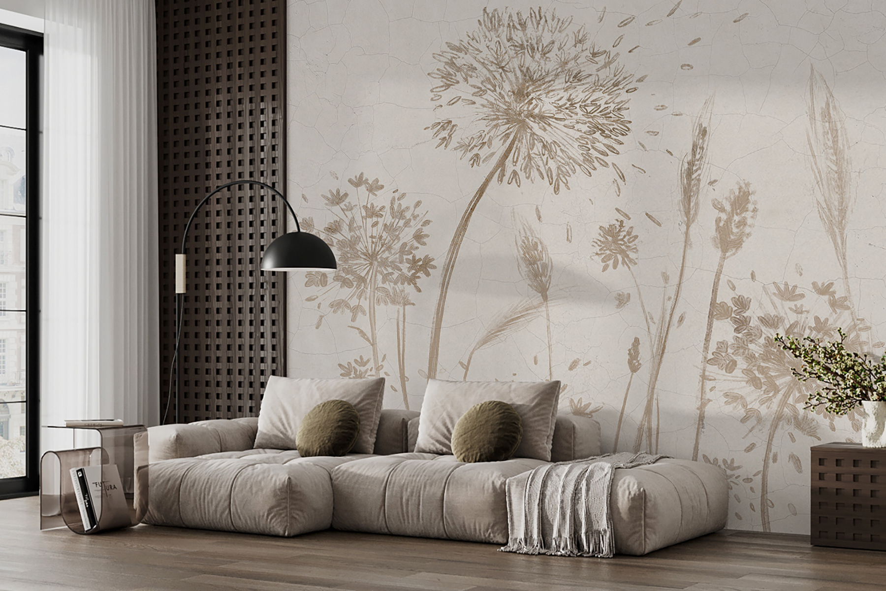 Imagine llevar la calma y la belleza de la naturaleza a su habitación. Eso es lo que hace “Fotomurales w07921”, es como un soplo de aire fresco para tus paredes. Imagínese delicadas flores silvestres y gráciles dientes de león, suavemente esbozados en suaves marrones y beiges, meciéndose como en una brisa de verano. Las grietas del fondo le dan un encanto rústico y vintage, como si el tiempo lo hubiera besado…
