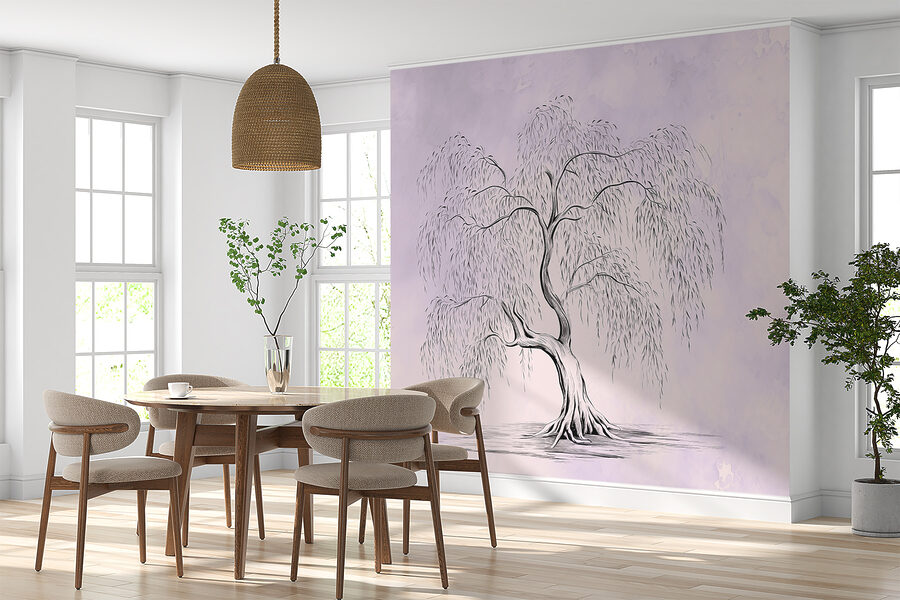 El fondo suave y difuminado, con sus tonos lavanda y crema, crea un ambiente sereno, casi mágico. Transforma instantáneamente una habitación en un refugio relajante. ¿Te imaginas despertarte así todos los días? ¿O tal vez tenerlo en un rincón de lectura acogedor donde puedas perderte en un libro con la pacífica compañía del árbol? Tiene algo que enraíza y tranquiliza.