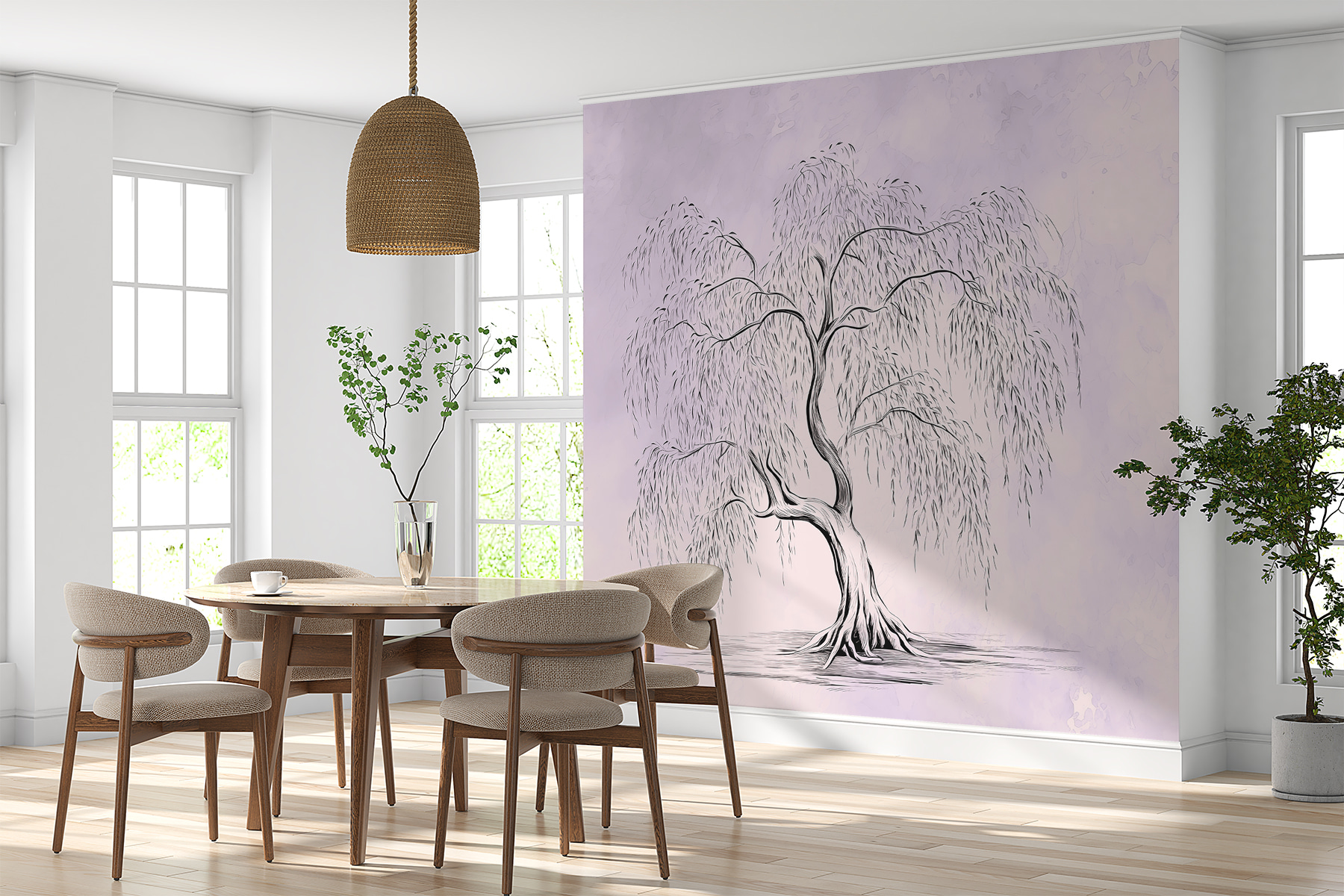 El fondo suave y difuminado, con sus tonos lavanda y crema, crea un ambiente sereno, casi mágico. Transforma instantáneamente una habitación en un refugio relajante. ¿Te imaginas despertarte así todos los días? ¿O tal vez tenerlo en un rincón de lectura acogedor donde puedas perderte en un libro con la pacífica compañía del árbol? Tiene algo que enraíza y tranquiliza.