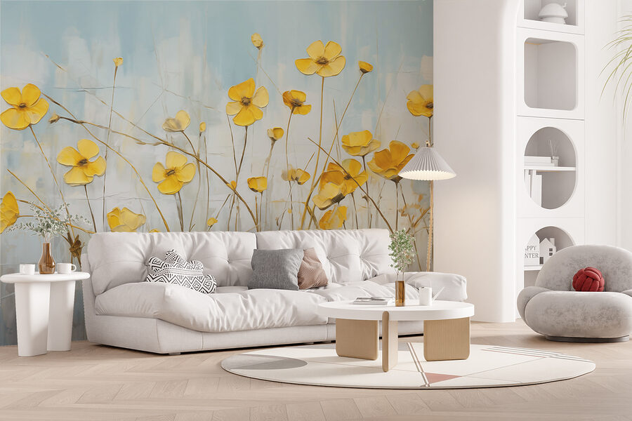 Imagine despertarse con un estallido de alegres flores amarillas bailando en su pared. Este mural, con sus vibrantes flores sobre un cielo suave y relajante, da vida a cualquier habitación. Es como llevar el jardín al interior sin la regadera. Perfecto para un acogedor rincón de desayuno o un rincón de lectura, añade ese toque perfecto de calidez y felicidad. Imagínate tomando café, rodeado de estas flores soleadas, sintiéndote animado al instante. Es como si un trocito de naturaleza susurrara dulces palabras a tu hogar, ¡sin necesidad de abejas!