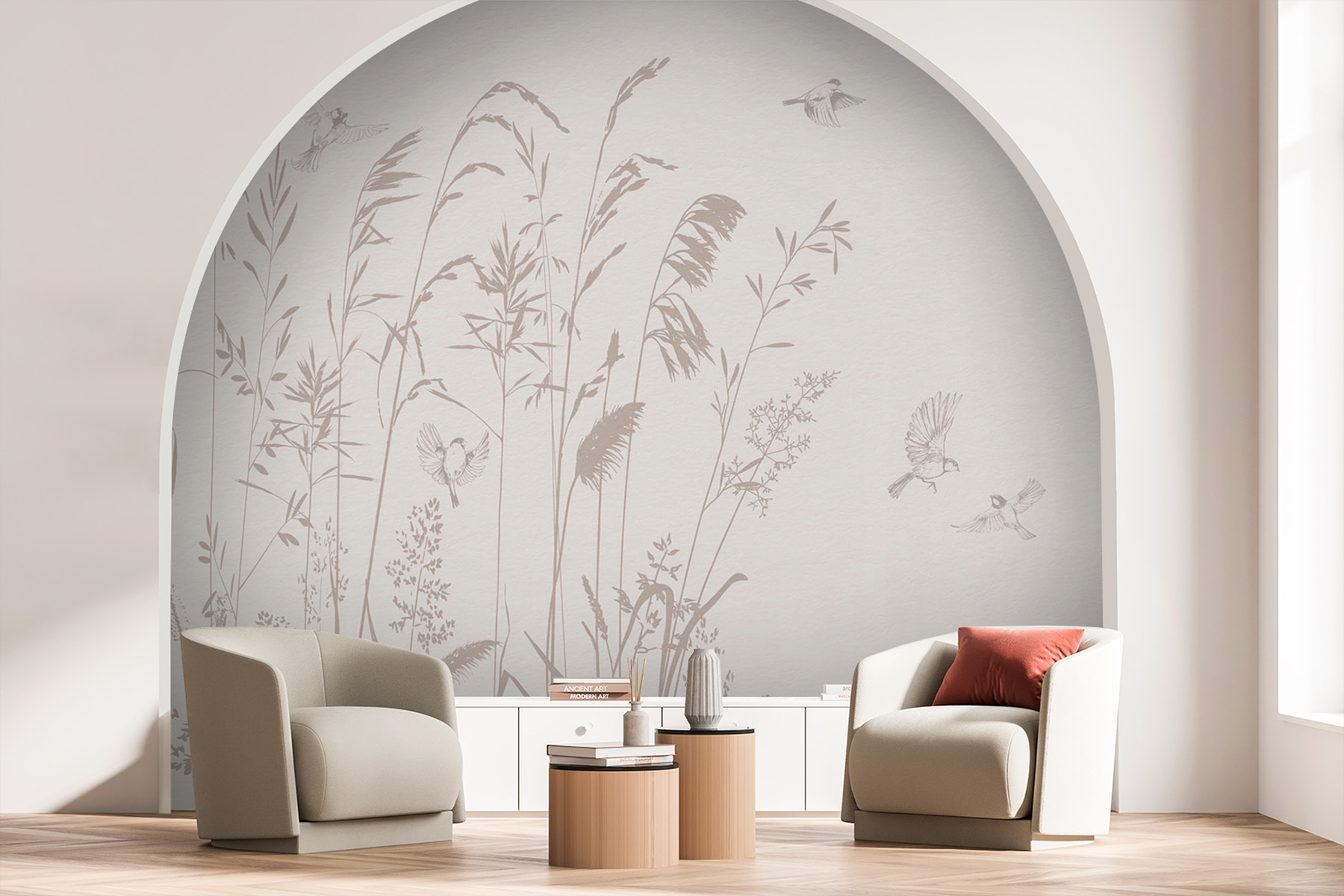 ¡Y esos pájaros! Están esparcidos como pequeñas notas de alegría, añadiendo vida y movimiento a tus paredes. Este mural consigue que todo parezca tranquilo y fresco, pero sutilmente vibrante. No exige atención, sino que la invita amablemente. Ideal para los amantes de un toque de naturaleza sin salir a la calle.