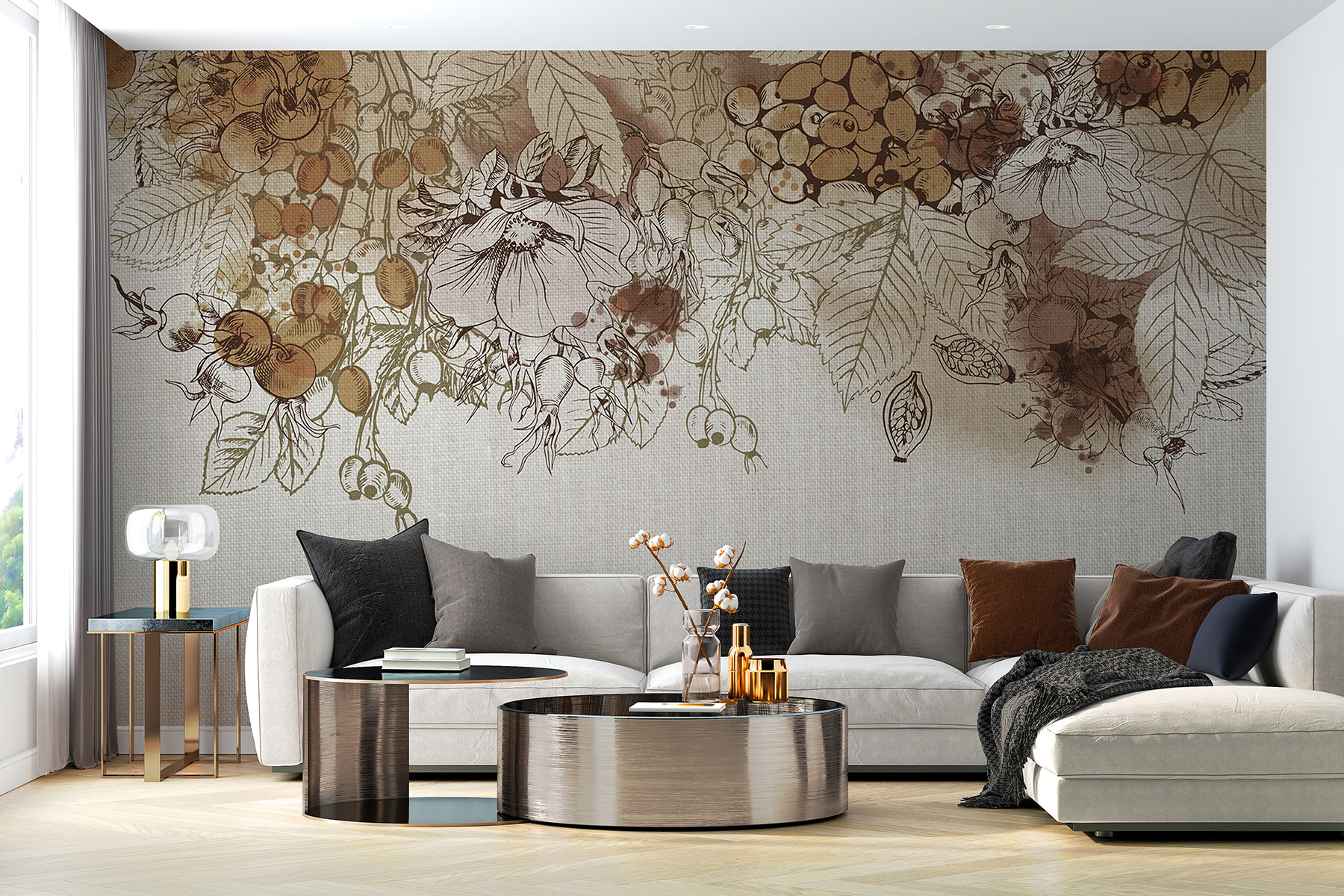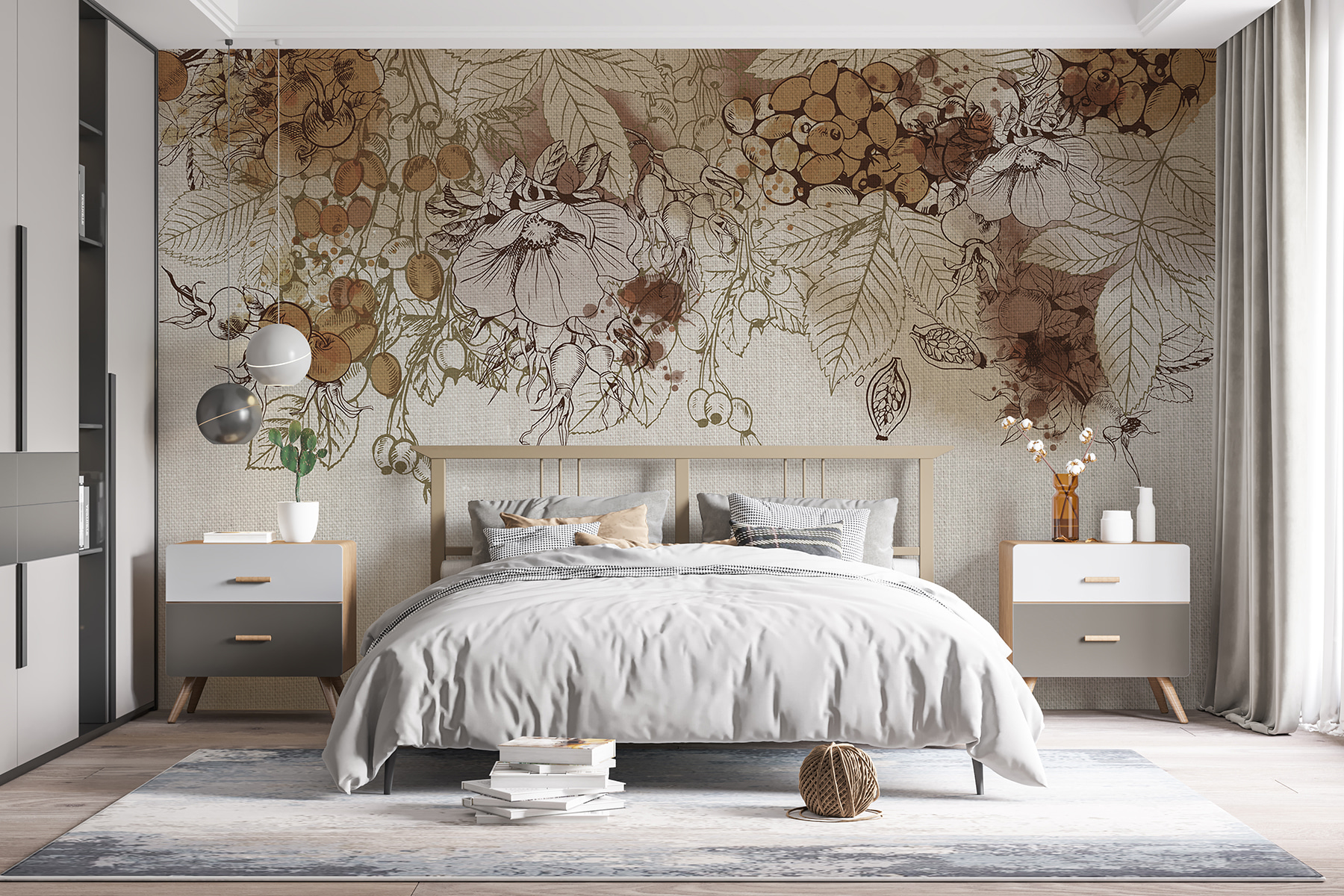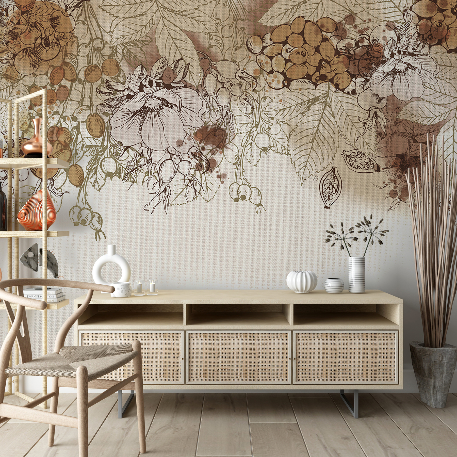 Transforme cualquier espacio con el encanto de Autumn Harvest en tonos sepia. Este mural captura la esencia del otoño con delicados dibujos y una paleta cálida y terrosa que resulta acogedora y atractiva. Imagínese acurrucarse con una taza de sidra caliente mientras contempla esta belleza en su pared, ¡es como llevar un toque de la cosecha al interior! La juguetona combinación de colores suaves y detalles intrincados inspira una ensoñación serena y llena de naturaleza. Perfecto para un salón, está destinado a suscitar conversaciones. Los amantes de la naturaleza se sentirán como en casa, como si estuvieran paseando por un tranquilo huerto a finales de otoño, empapándose de la belleza de los frutos de la naturaleza. Añádelo a tus paredes y verás cómo tu espacio cobra vida con calidez y carácter.