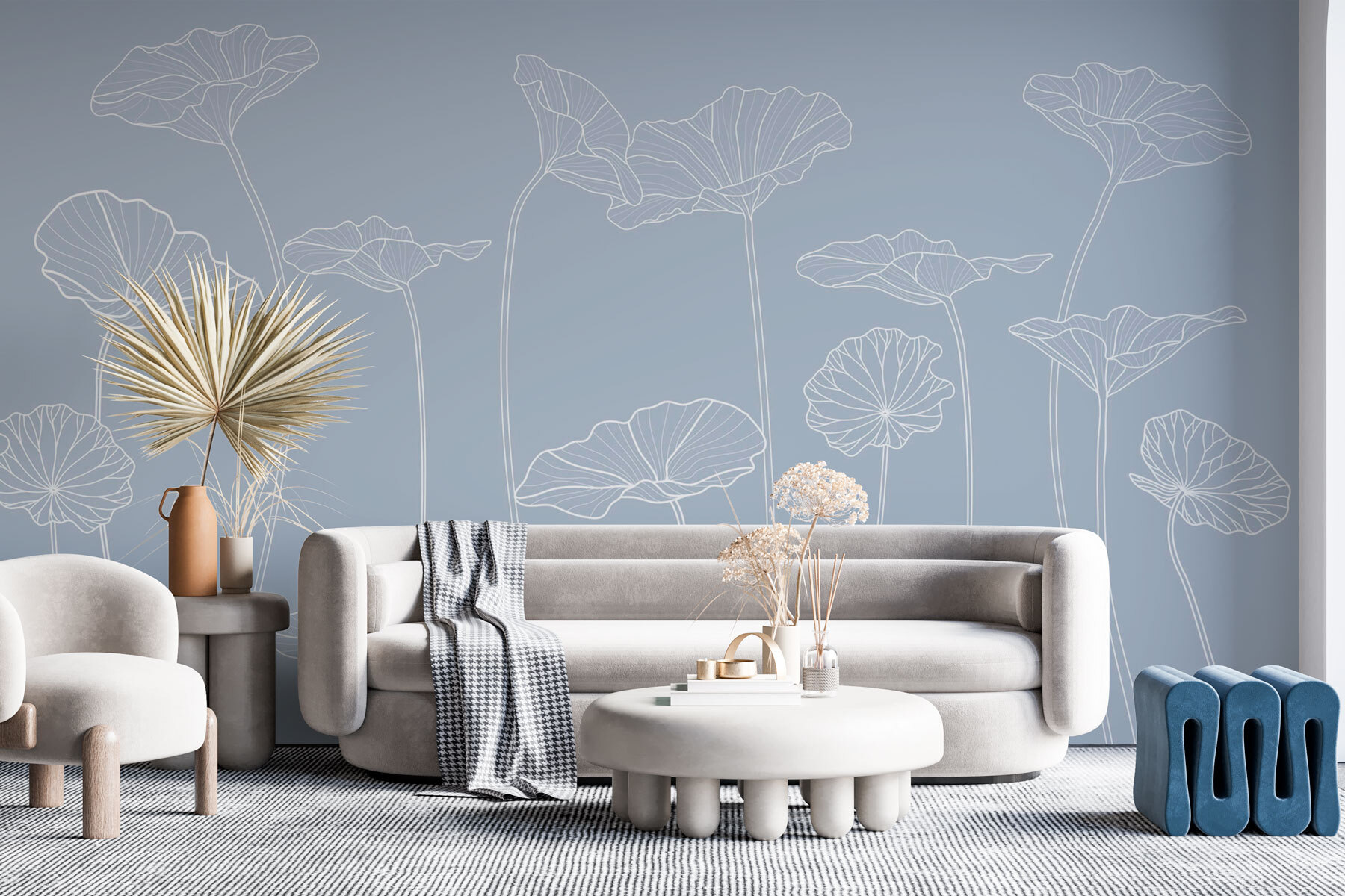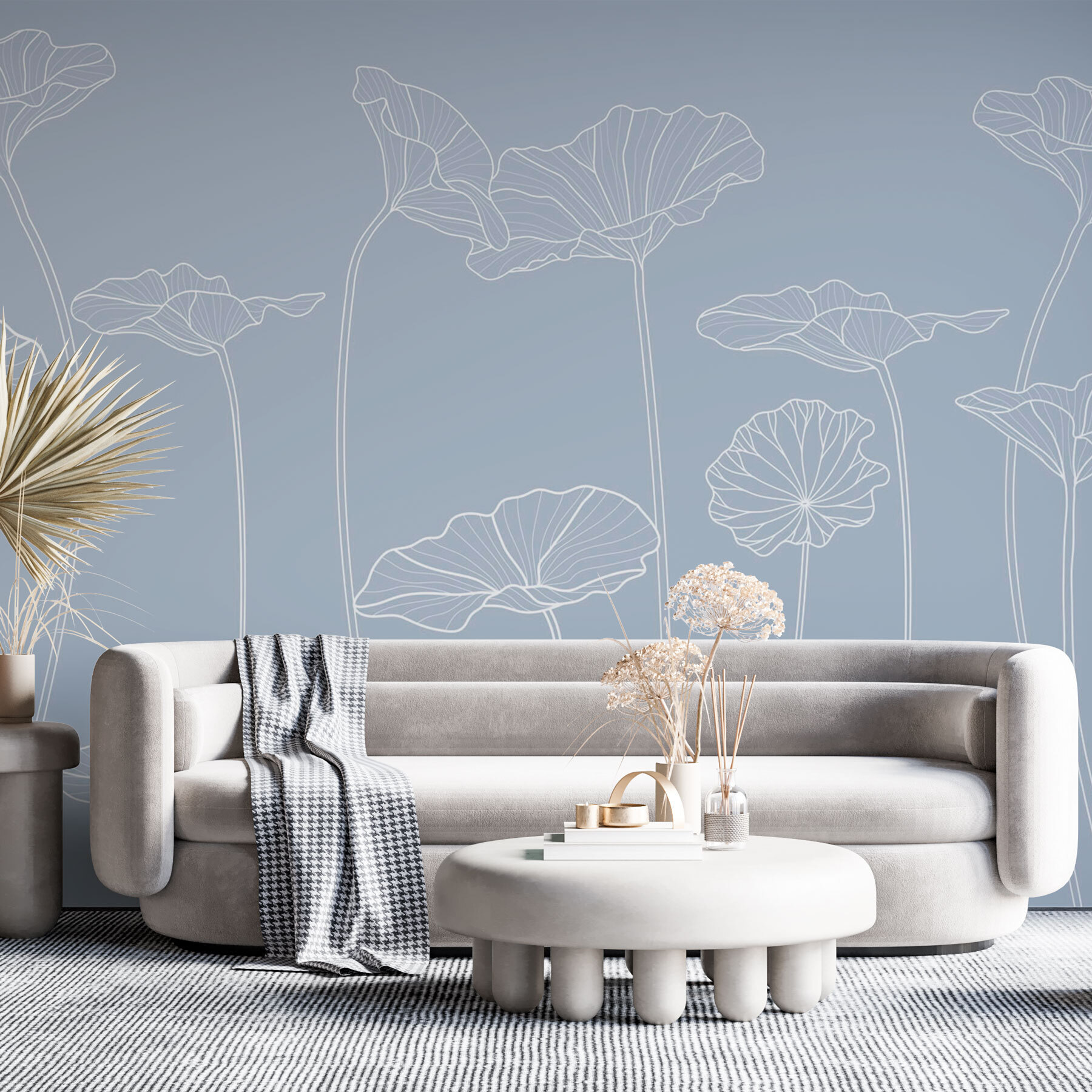 Transforme su espacio con este precioso mural de pared con delicados dibujos lineales de flores. Es como llevar un soplo de aire fresco a tu salón, dormitorio o incluso a ese acogedor rincón de lectura. El suave fondo azul añade un toque calmante, mientras que los sencillos pero elegantes diseños florales invitan a una sensación de serenidad. Imagínese acurrucado con un buen libro, la belleza de la naturaleza envolviéndole, despertando la inspiración en los momentos cotidianos. Perfecto para los que prefieren un toque de naturaleza sin exagerar. Susurra elegancia, ¿no le parece?