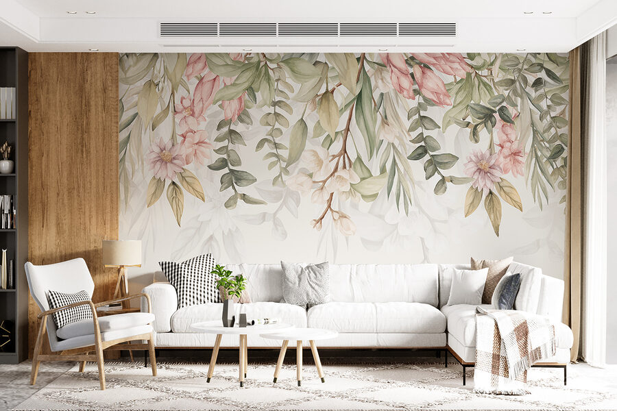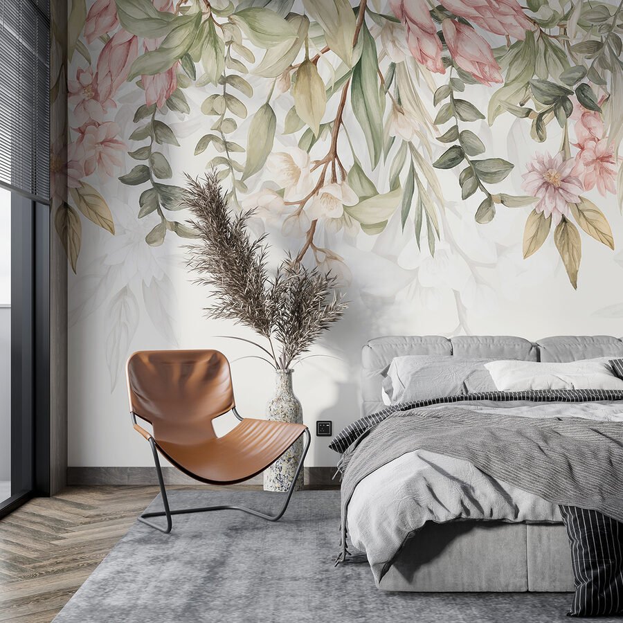 La mezcla de rosas suaves y verdes sutiles crea un ambiente relajante y acogedor, perfecto para tomar un café el domingo por la mañana o relajarse por la noche con un buen libro. Te hace sentir como si estuvieras entrando en un boceto botánico, aportando ese toque justo de frescura y serenidad. Piense en esos días en los que sólo quiere estar rodeado de belleza y sencillez: este mural es lo que necesita.