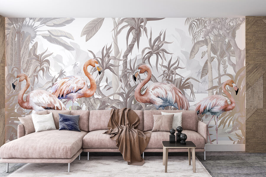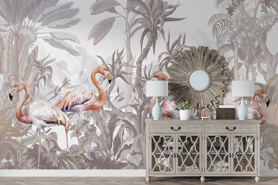 Adéntrese en un mundo de fantasía con este mural de flamencos. Imagínese tomando su café de la mañana mientras estos elegantes pájaros – posados en medio de un exuberante follaje tropical – iluminan su espacio. Los tonos suaves crean un ambiente sereno, casi como si estuvieras en unas mini-vacaciones todos los días. Perfecto para añadir un toque de naturaleza a tu salón o dormitorio. Es como tener un trozo de paraíso escondido en la pared. ¿Quién diría que los flamencos podrían ser tus nuevos mejores amigos en decoración? La sofisticación de las plumas se une al encanto relajado.