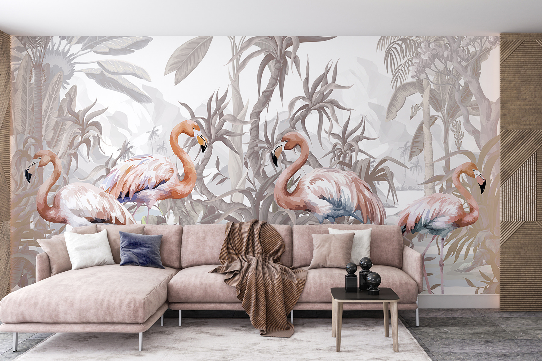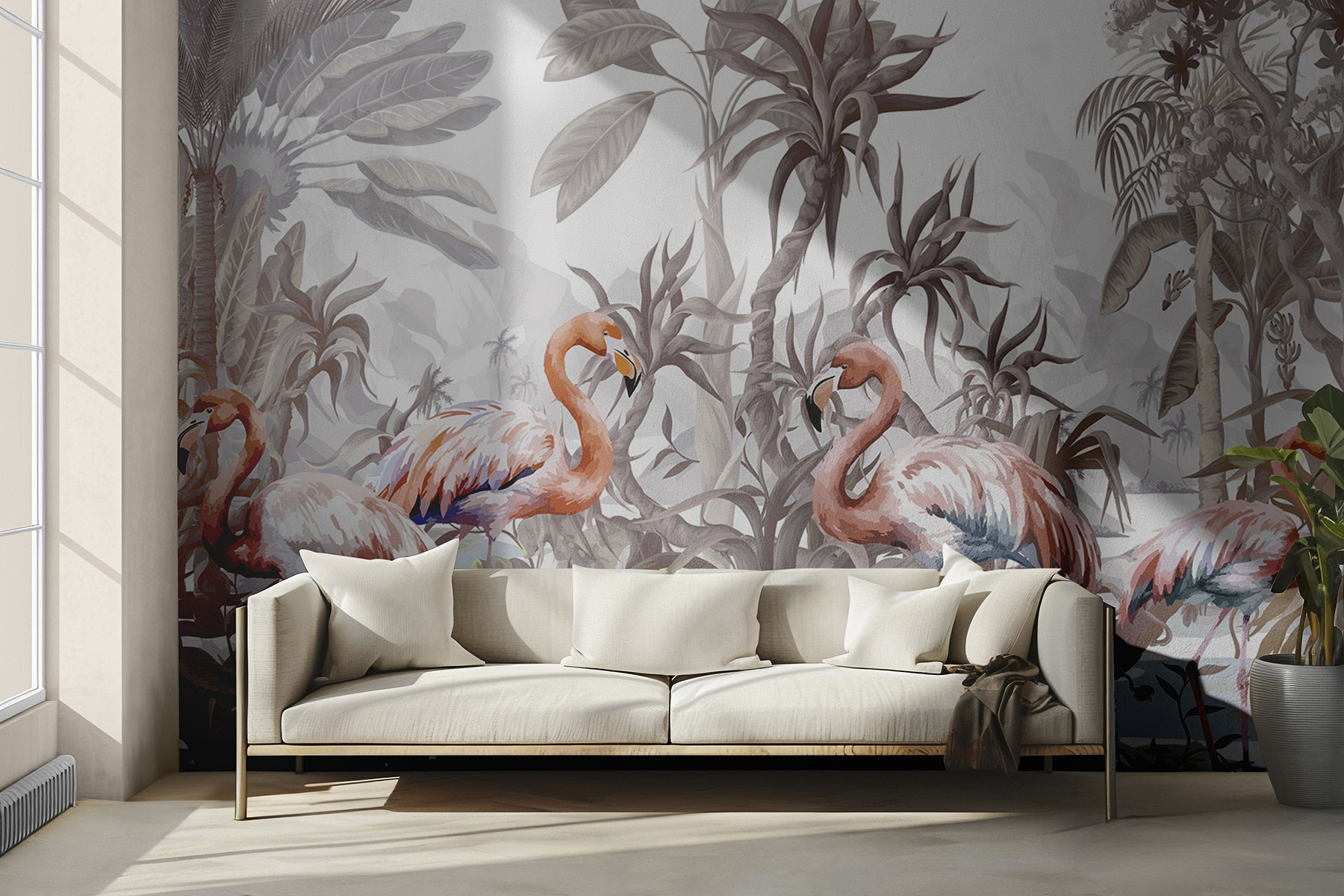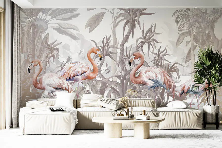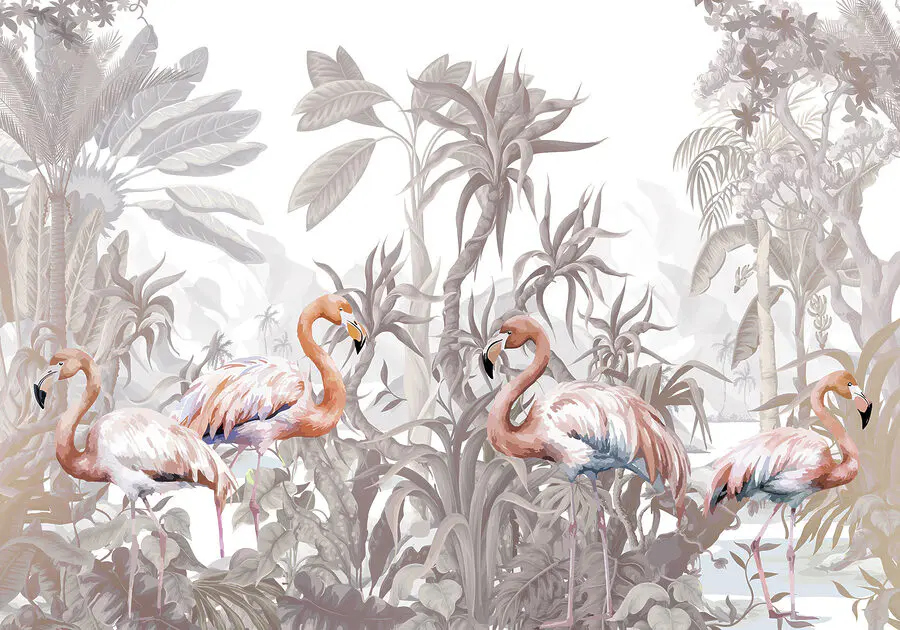 Adéntrese en un mundo de fantasía con este mural de flamencos. Imagínese tomando su café de la mañana mientras estos elegantes pájaros – posados en medio de un exuberante follaje tropical – iluminan su espacio. Los tonos suaves crean un ambiente sereno, casi como si estuvieras en unas mini-vacaciones todos los días. Perfecto para añadir un toque de naturaleza a tu salón o dormitorio. Es como tener un trozo de paraíso escondido en la pared. ¿Quién diría que los flamencos podrían ser tus nuevos mejores amigos en decoración? La sofisticación de las plumas se une al encanto relajado.