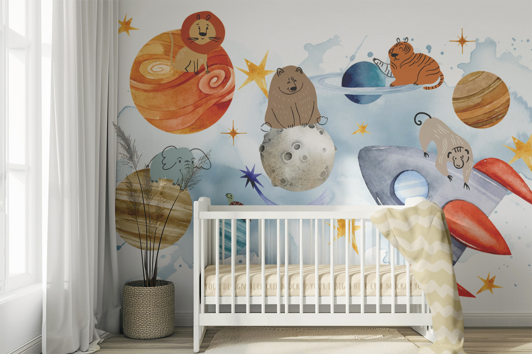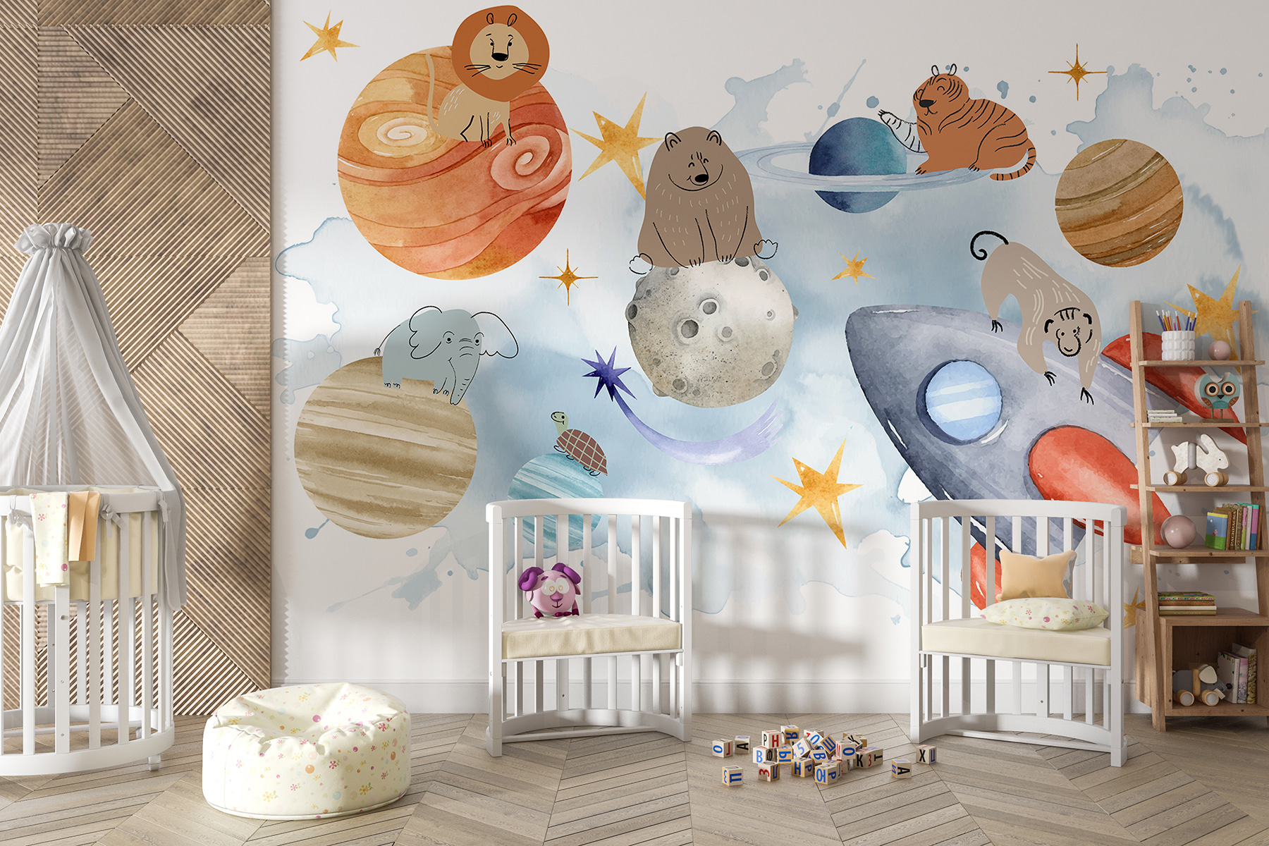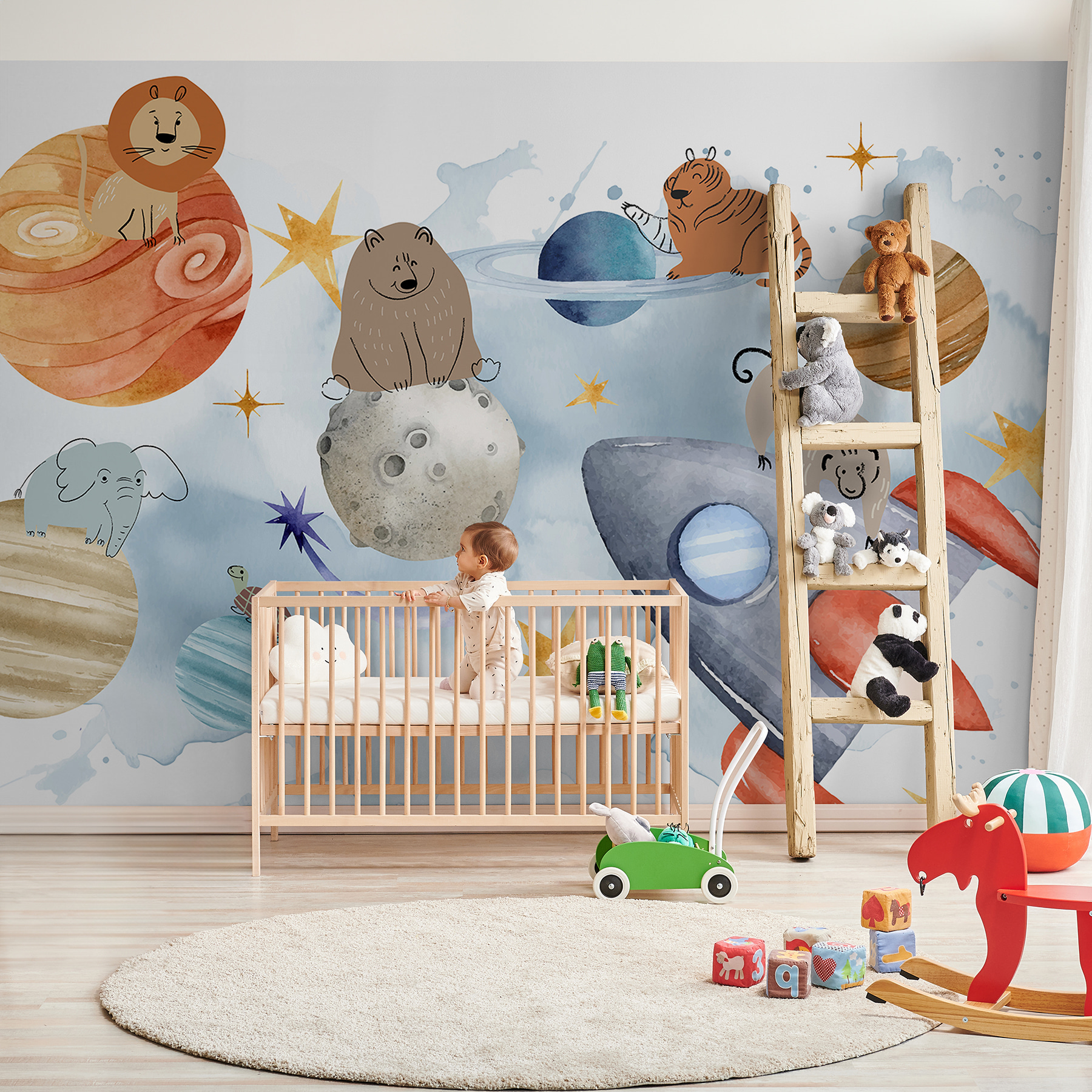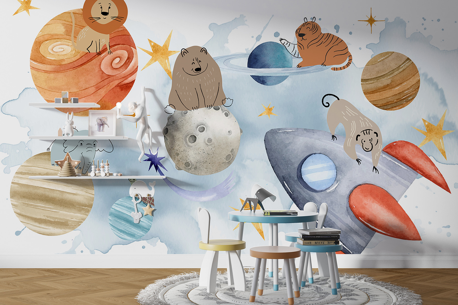 Adéntrate en un mundo de fantasía con este mural “Grupo de animales en el espacio”. Imagina una habitación en la que leones, osos y tigres orbitan planetas como astronautas experimentados. Es perfecto para añadir un toque de encanto galáctico, con huellas planetarias y todo. Imagínate despertar con un león posado en Júpiter o una tortuga dando un paseo cósmico. Habitaciones infantiles, despachos, lo que se te ocurra: es como tener un zoo en órbita. Tus paredes te agradecerán la aventura. ¿Listo para despegar?