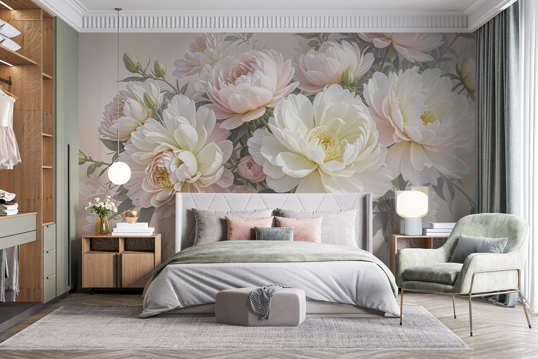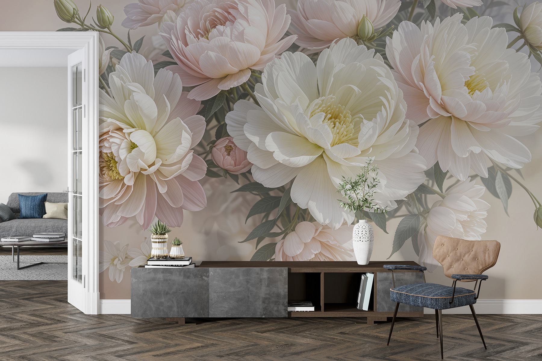 Imagínese entrar en una habitación y ser recibido por este mar de ensueño de flores blancas y rosas, ¡como si entrara en un jardín de cuento de hadas! Este mural susurra elegancia y alegría, ¿verdad? Perfecto para convertir cualquier espacio aburrido en un remanso de serenidad. Imagínate despertar con estas peonías gigantes envolviéndote en un suave abrazo floral. Es como si la naturaleza hubiera decidido acampar en tu pared. Perfecto tanto para soñadores como para amantes de las flores, es un acogedor abrazo artístico que te alegrará el día. Sólo tienes que añadir una silla cómoda, un buen libro y dejar que las flores hagan su magia.