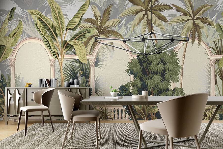 Imagínese entrar en su habitación y sentir que ha entrado en un sereno oasis tropical. Este mural, con sus gráciles palmeras meciéndose suavemente contra elegantes arcos, crea esa sensación sin esfuerzo. Es como una pequeña escapada: una ventana a una exuberante selva sin salir de casa. Perfecto para añadir un toque de naturaleza y aventura a tu espacio. ¿Quién diría que una pared podría ser tu billete al paraíso? Añade unos cómodos asientos y puede que te pierdas soñando despierto con la brisa de la isla.