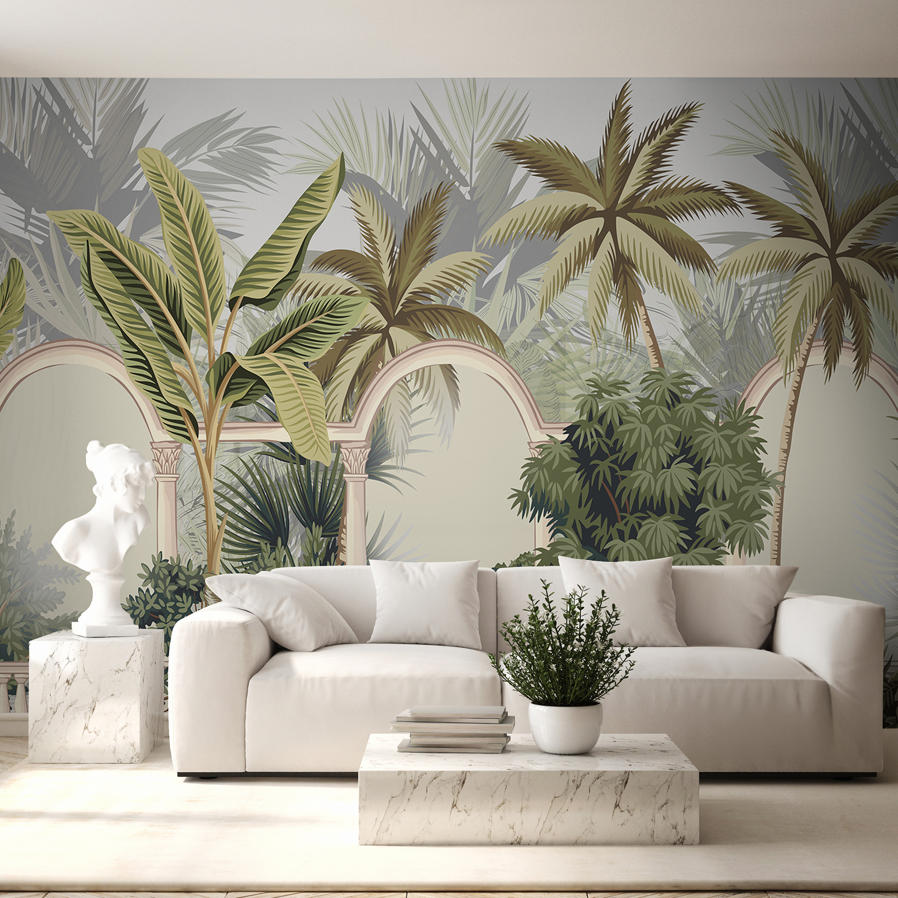 Imagínese entrar en su habitación y sentir que ha entrado en un sereno oasis tropical. Este mural, con sus gráciles palmeras meciéndose suavemente contra elegantes arcos, crea esa sensación sin esfuerzo. Es como una pequeña escapada: una ventana a una exuberante selva sin salir de casa. Perfecto para añadir un toque de naturaleza y aventura a tu espacio. ¿Quién diría que una pared podría ser tu billete al paraíso? Añade unos cómodos asientos y puede que te pierdas soñando despierto con la brisa de la isla.