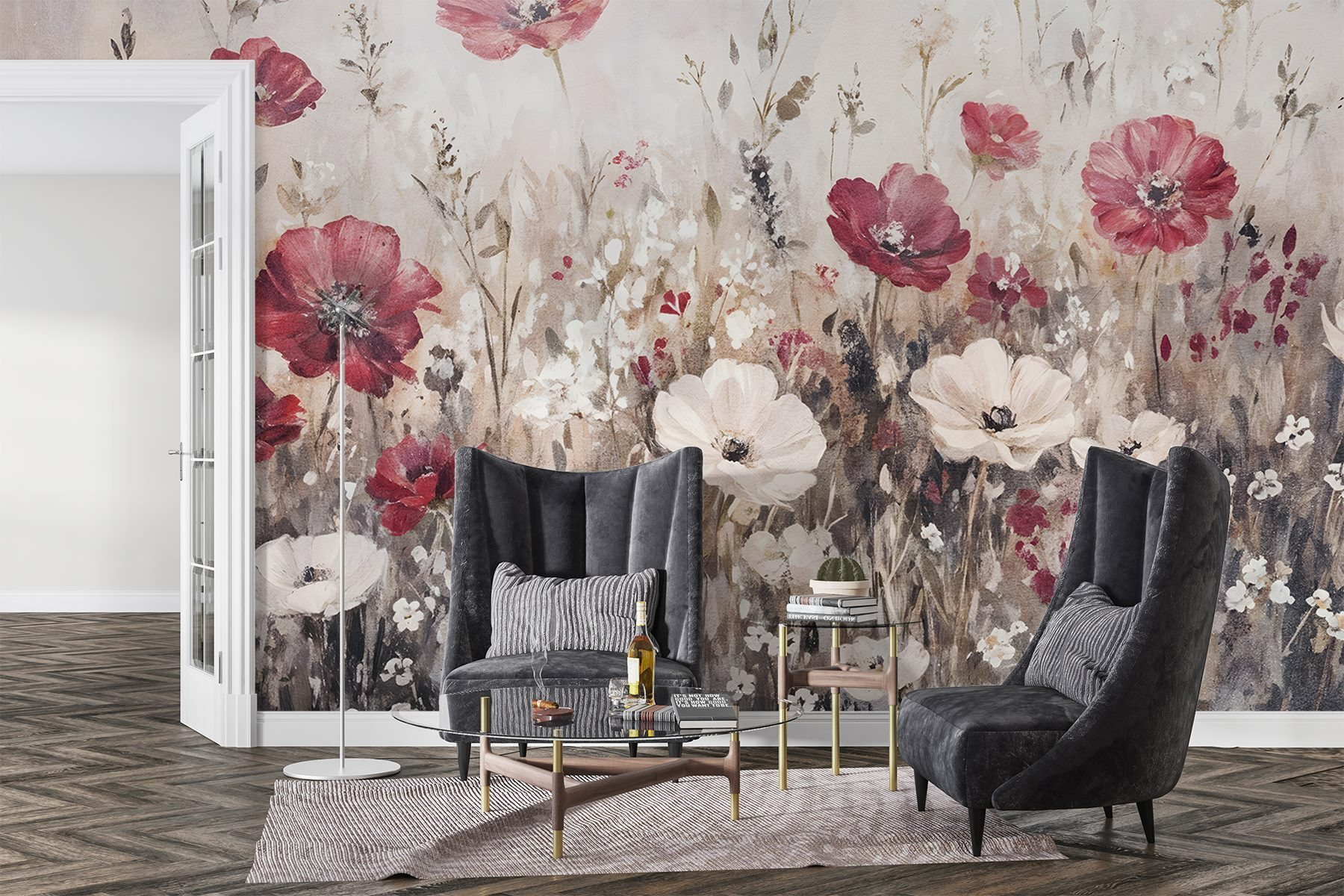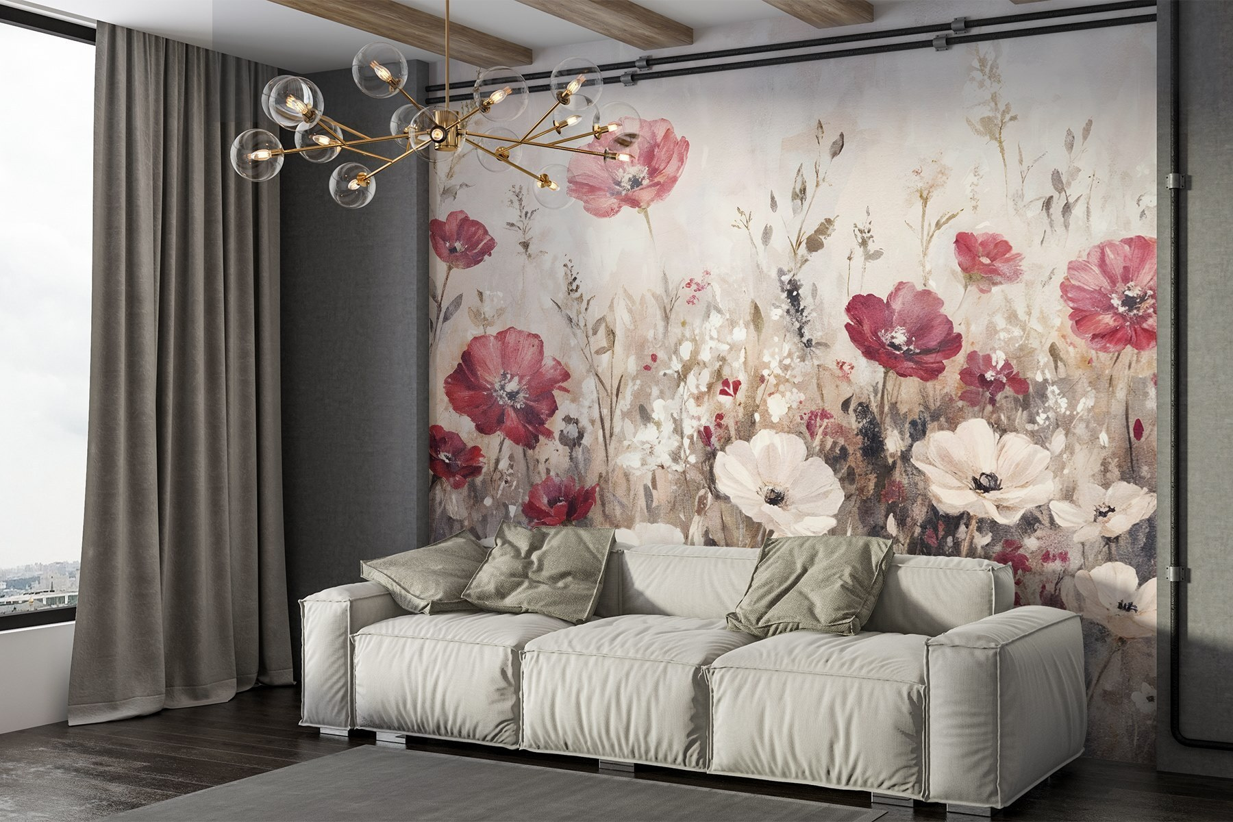 Transforme cualquier habitación en una escapada serena con este impresionante mural de flores bailando con la brisa. Imagínatelo: la luz del sol entrando a raudales y esas preciosas flores en rojos y blancos suaves cayendo en cascada por la pared como si fueran obras de arte de la naturaleza. Es como llevar un fresco día de primavera al interior, sin el molesto polen, por supuesto. Este mural de acuarela es perfecto para un acogedor salón o un tranquilo dormitorio. Imagínate relajándote con un libro, rodeado de esta belleza natural. Te levantará el ánimo al instante, ¿verdad? Tu pared ya no es sólo una pared, es un paraíso en flor.
