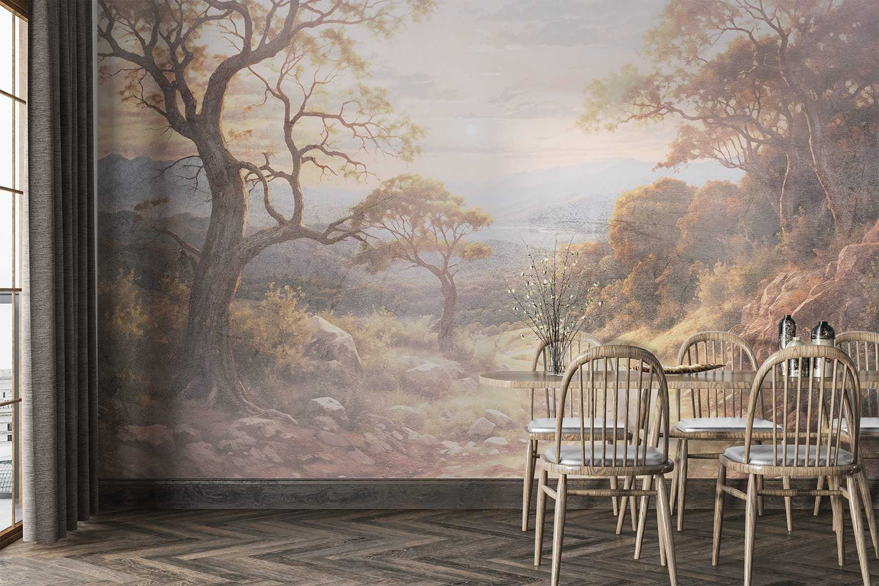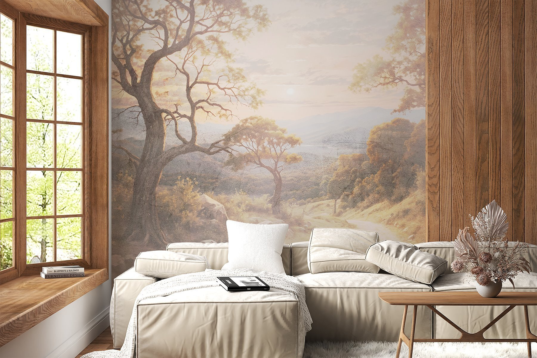 Transforme cualquier habitación en una escapada serena con este encantador mural de pared, que muestra un sinuoso camino de tierra flanqueado por majestuosos árboles y montañas lejanas. Imagínese entrar en un refugio tranquilo cada vez que entre en su espacio. Los colores suaves y las suaves texturas te atraen, como si te invitaran a pasear por ese camino de ensueño. Perfecto para salones o rincones de lectura, susurra calma y lleva la belleza de la naturaleza al interior. Piensa que tus amigos te preguntarán si te has mudado al campo. Renueva tus paredes y deja que fluyan las vibraciones relajantes; este mural tiene la magia de la naturaleza para compartir.