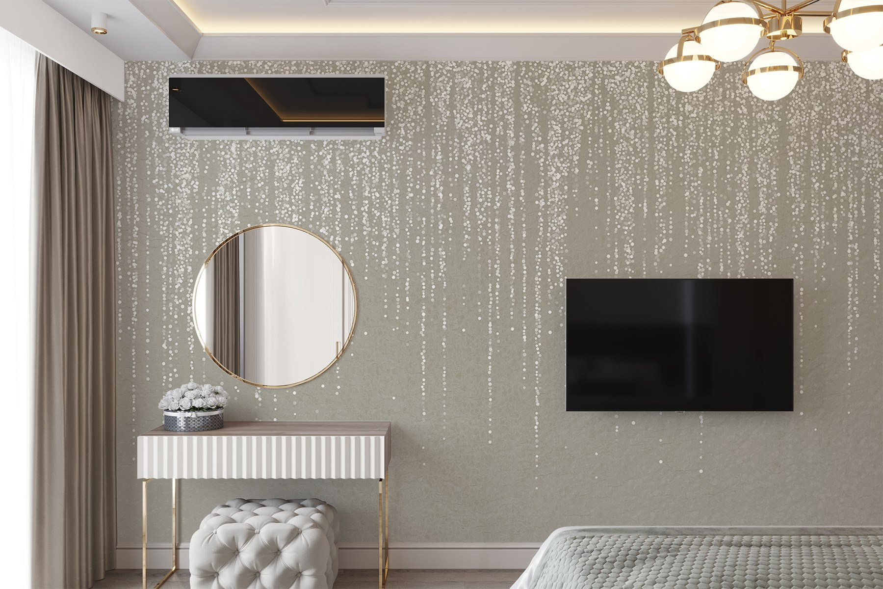 Transformar un espacio puede parecer mágico, y este mural, “Manchas blancas sobre una superficie gris”, lo consigue. Imagínese que entra en una habitación en la que esas suaves manchas parecen bailar juguetonamente sobre un fondo gris tranquilo. Es como una suave nevada, pero en la pared.
